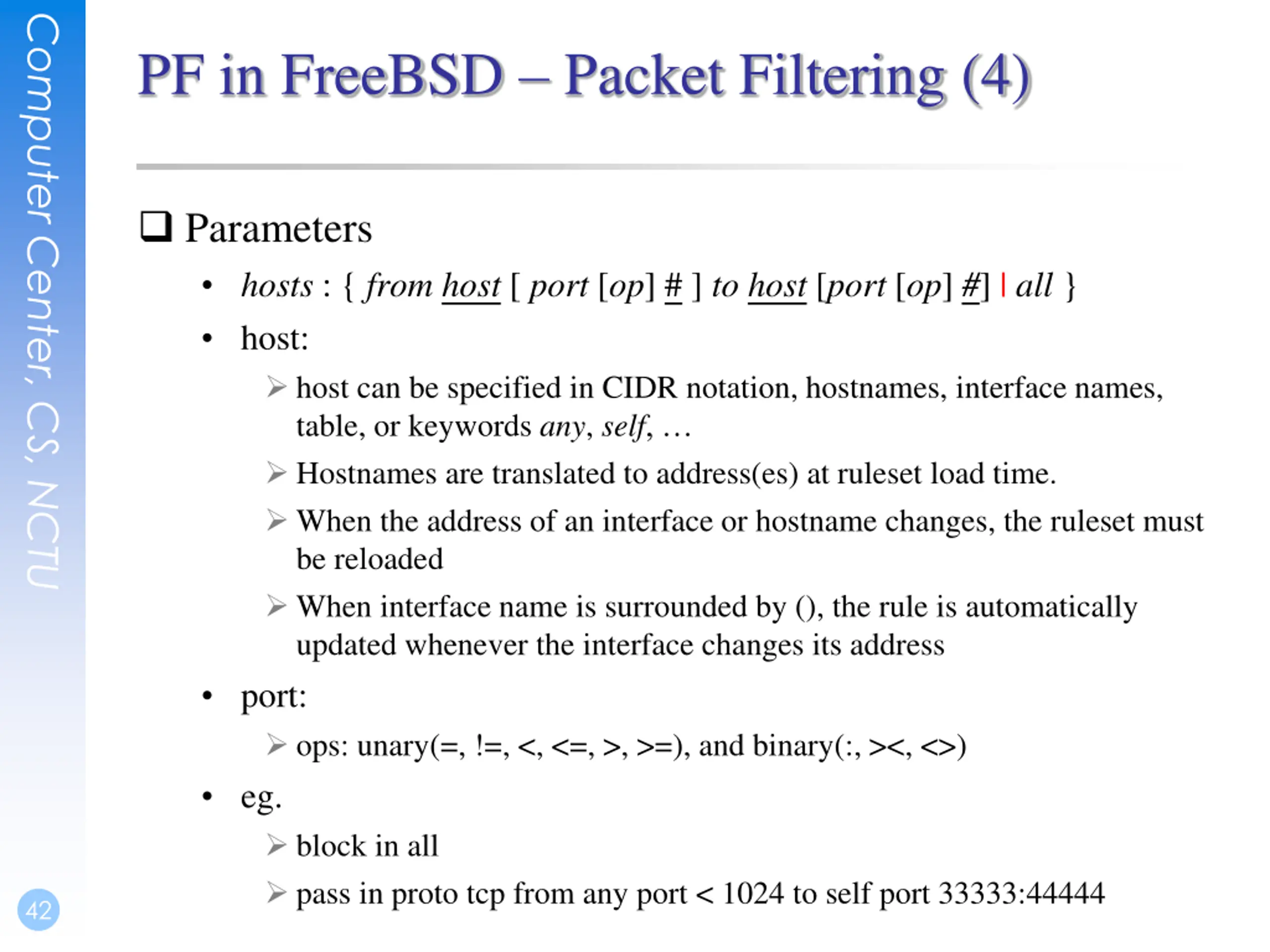 Computer Center, CS, NCTU PF in FreeBSD Packet Filtering (4) Parameters hosts : { from host [ port [op] # ] to host [port [op] #] | all } host: host can be specified in CIDR notation, hostnames, interface names, table, or keywords any, self, Hostnames are translated to address(es) at ruleset load time. When the address of an interface or hostname changes, the ruleset must be reloaded When interface name is surrounded by (), the rule is automatically updated whenever the interface changes its address port: ops: unary(=, !=, <, <=, >, >=), and binary(:, ><, <>) eg. block in all pass in proto tcp from any port < 1024 to self port 33333:44444 42