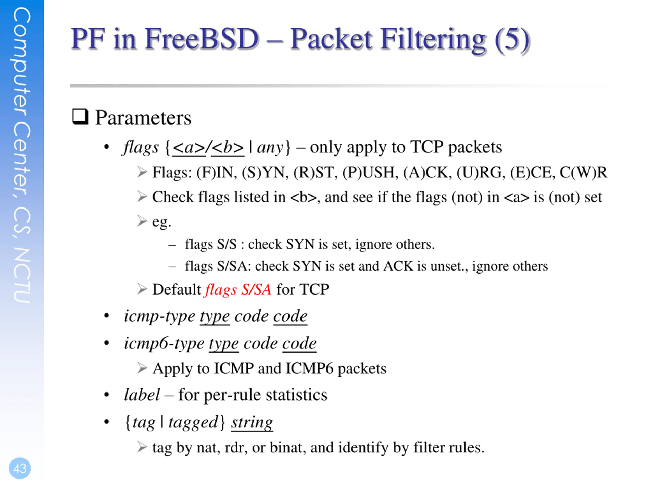 Computer Center, CS, NCTU PF in FreeBSD Packet Filtering (5) Parameters flags {<a>/<b> | any} only apply to TCP packets Flags: (F)IN, (S)YN, (R)ST, (P)USH, (A)CK, (U)RG, (E)CE, C(W)R Check flags listed in <b>, and see if the flags (not) in <a> is (not) set eg. flags S/S : check SYN is set, ignore others. flags S/SA: check SYN is set and ACK is unset., ignore others Default flags S/SA for TCP icmp-type type code code icmp6-type type code code Apply to ICMP and ICMP6 packets label for per-rule statistics {tag | tagged} string tag by nat, rdr, or binat, and identify by filter rules. 43