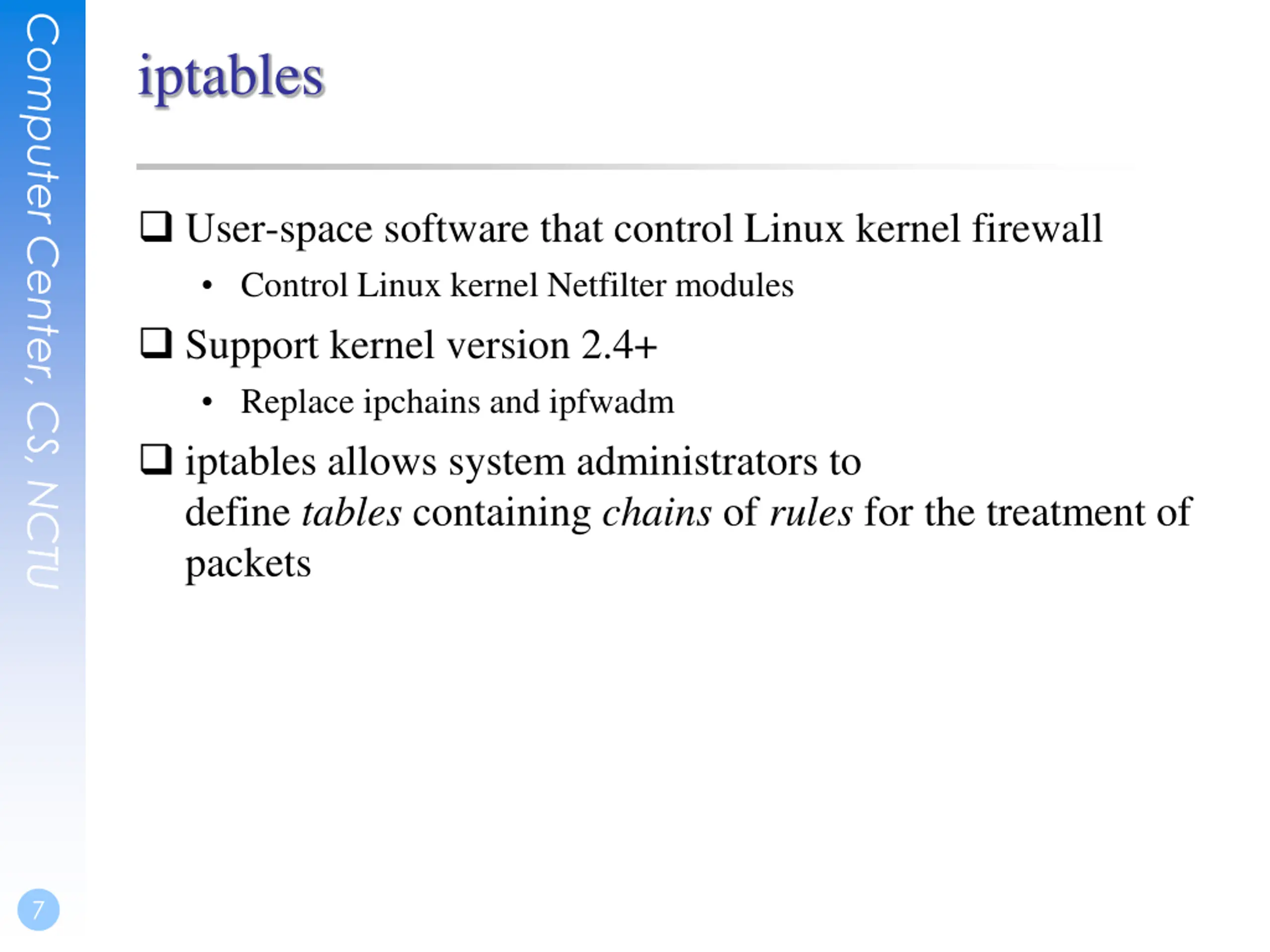Computer Center, CS, NCTU iptables User-space software that control Linux kernel firewall Control Linux kernel Netfilter modules Support kernel version 2.4+ Replace ipchains and ipfwadm iptables allows system administrators to define tables containing chains of rules for the treatment of packets 7