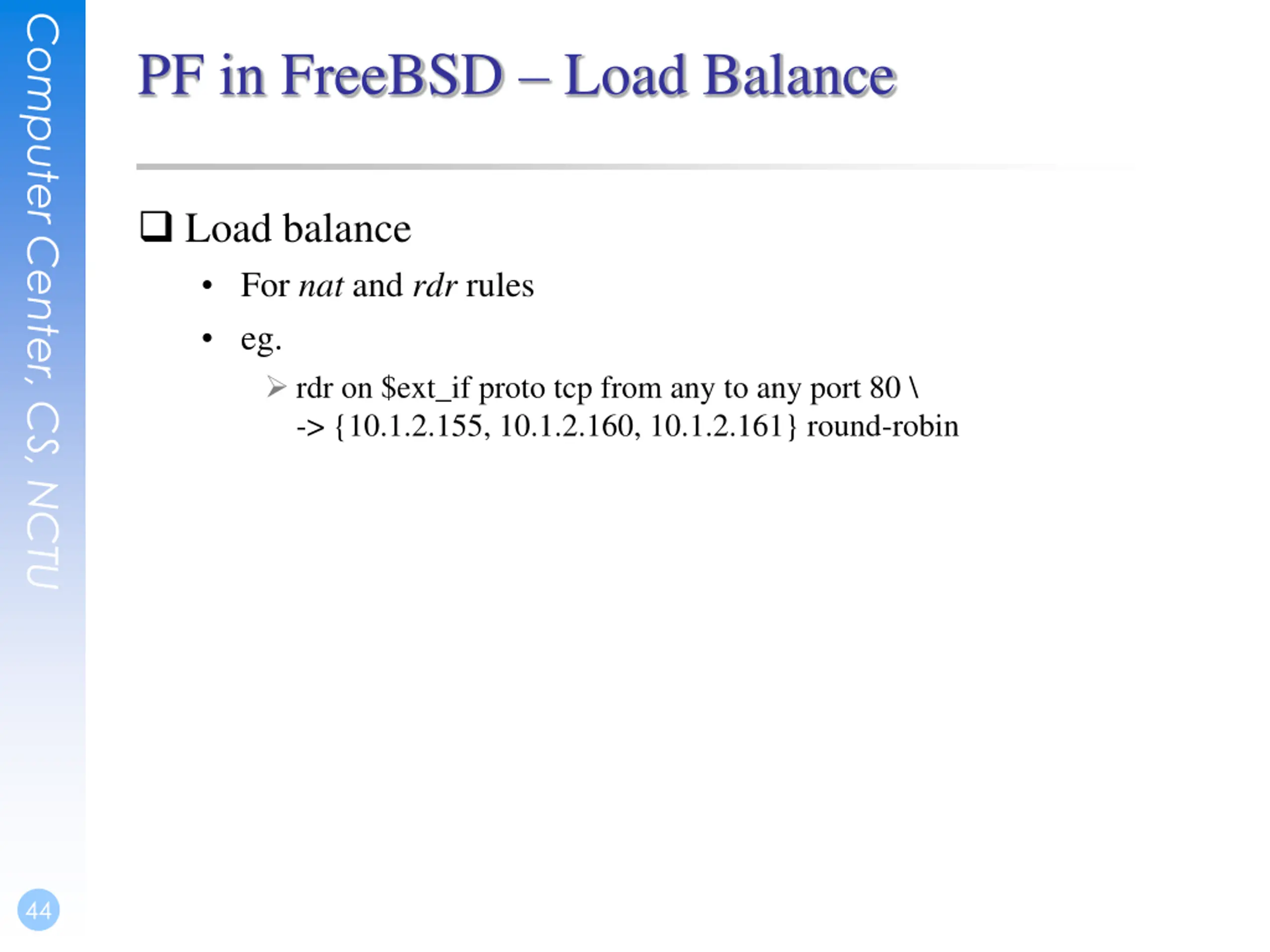 Computer Center, CS, NCTU PF in FreeBSD Load Balance Load balance For nat and rdr rules eg. rdr on $ext_if proto tcp from any to any port 80 \ -> {10.1.2.155, 10.1.2.160, 10.1.2.161} round-robin 44