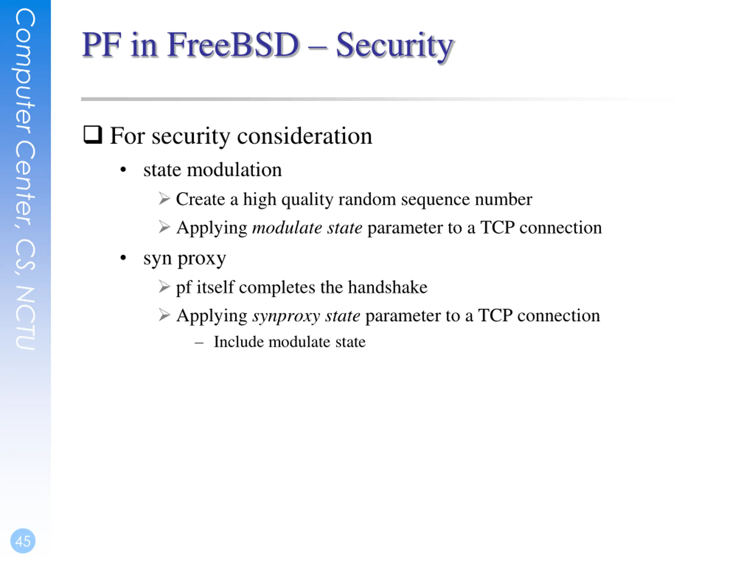 Computer Center, CS, NCTU PF in FreeBSD Security For security consideration state modulation Create a high quality random sequence number Applying modulate state parameter to a TCP connection syn proxy pf itself completes the handshake Applying synproxy state parameter to a TCP connection Include modulate state 45