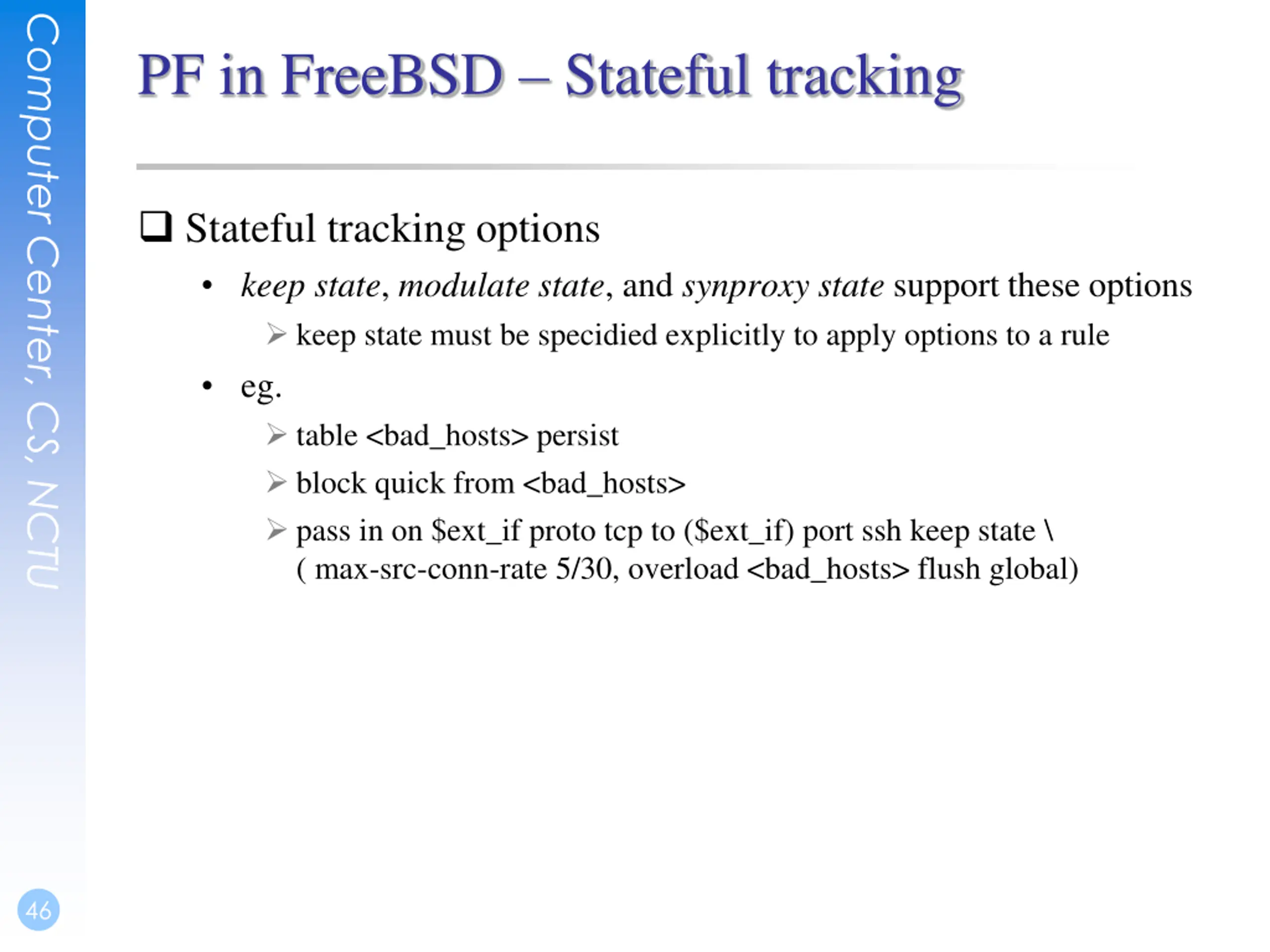 Computer Center, CS, NCTU PF in FreeBSD Stateful tracking Stateful tracking options keep state, modulate state, and synproxy state support these options keep state must be specidied explicitly to apply options to a rule eg. table <bad_hosts> persist block quick from <bad_hosts> pass in on $ext_if proto tcp to ($ext_if) port ssh keep state \ ( max-src-conn-rate 5/30, overload <bad_hosts> flush global) 46