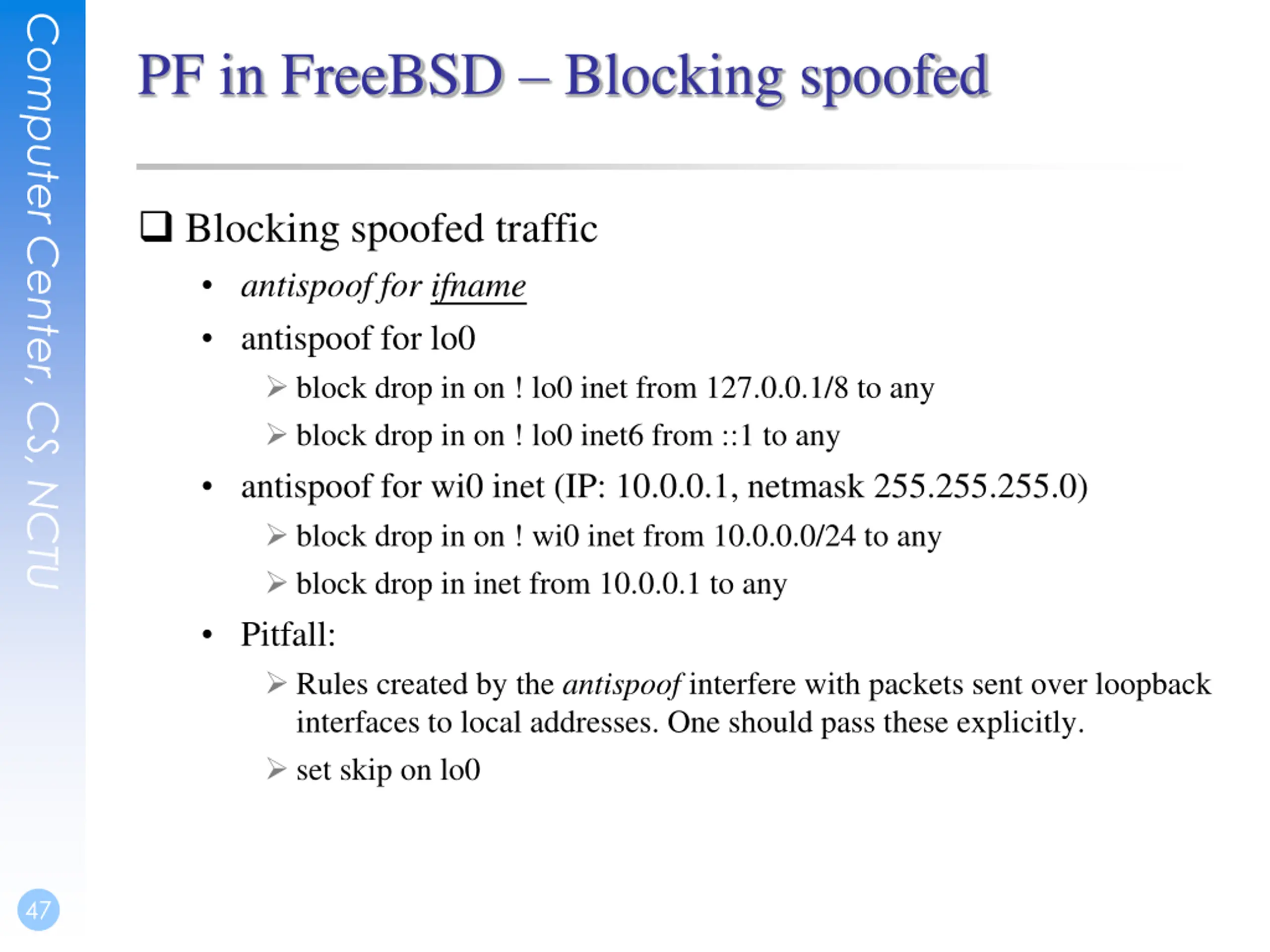 Computer Center, CS, NCTU PF in FreeBSD Blocking spoofed Blocking spoofed traffic antispoof for ifname antispoof for lo0 block drop in on ! lo0 inet from 127.0.0.1/8 to any block drop in on ! lo0 inet6 from ::1 to any antispoof for wi0 inet (IP: 10.0.0.1, netmask 255.255.255.0) block drop in on ! wi0 inet from 10.0.0.0/24 to any block drop in inet from 10.0.0.1 to any Pitfall: Rules created by the antispoof interfere with packets sent over loopback interfaces to local addresses. One should pass these explicitly. set skip on lo0 47