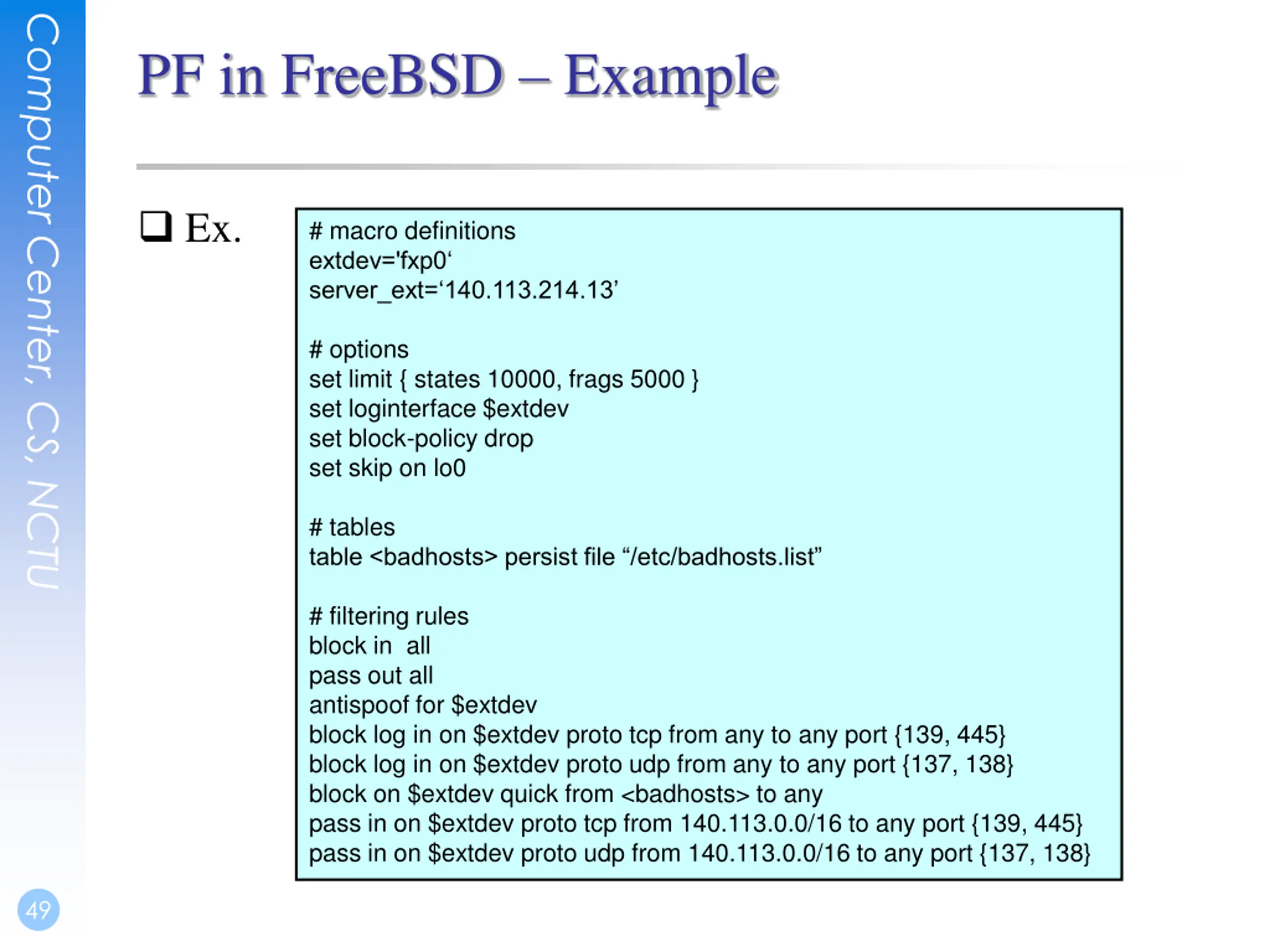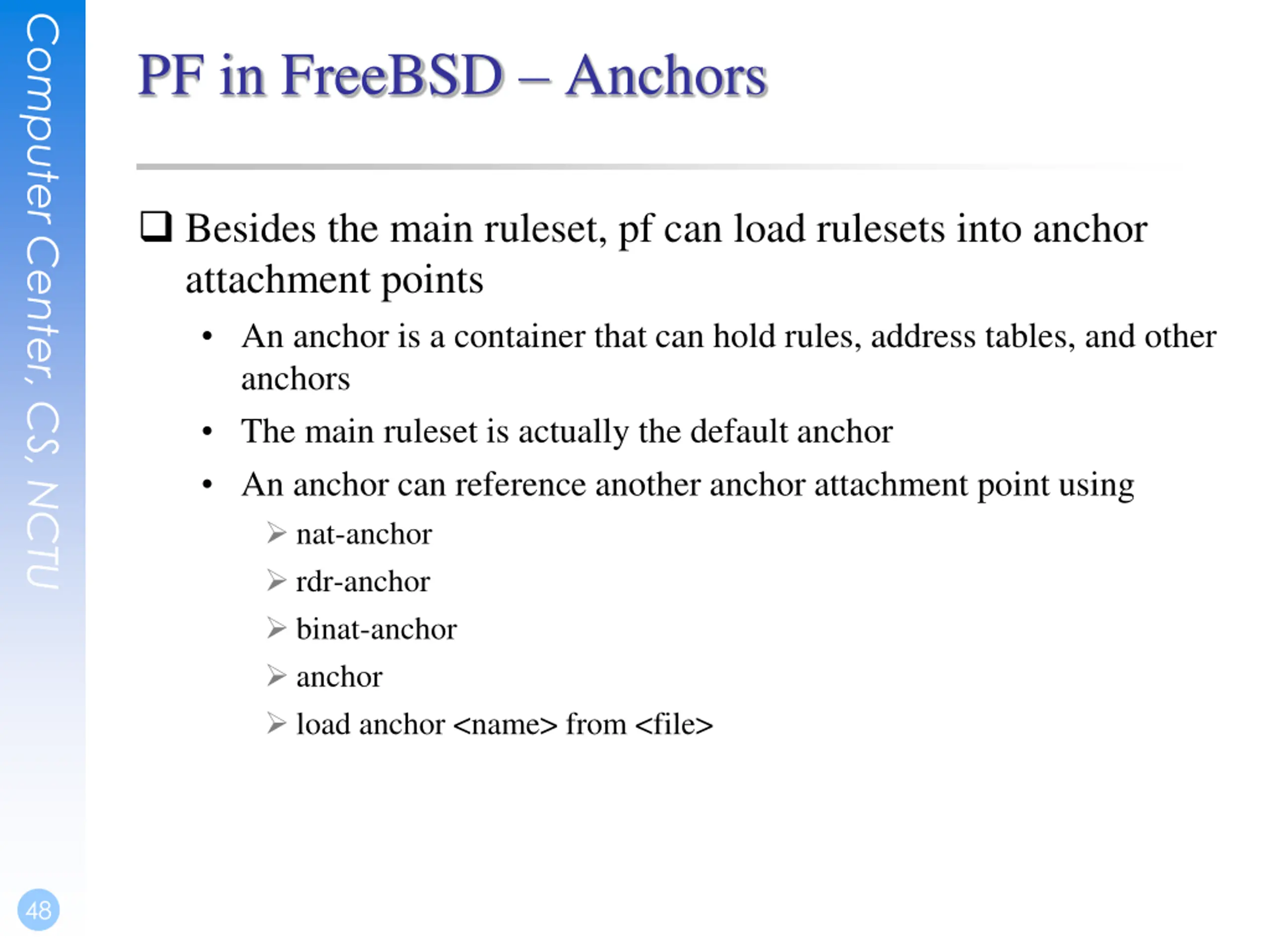 Computer Center, CS, NCTU PF in FreeBSD Anchors Besides the main ruleset, pf can load rulesets into anchor attachment points An anchor is a container that can hold rules, address tables, and other anchors The main ruleset is actually the default anchor An anchor can reference another anchor attachment point using nat-anchor rdr-anchor binat-anchor anchor load anchor <name> from <file> 48