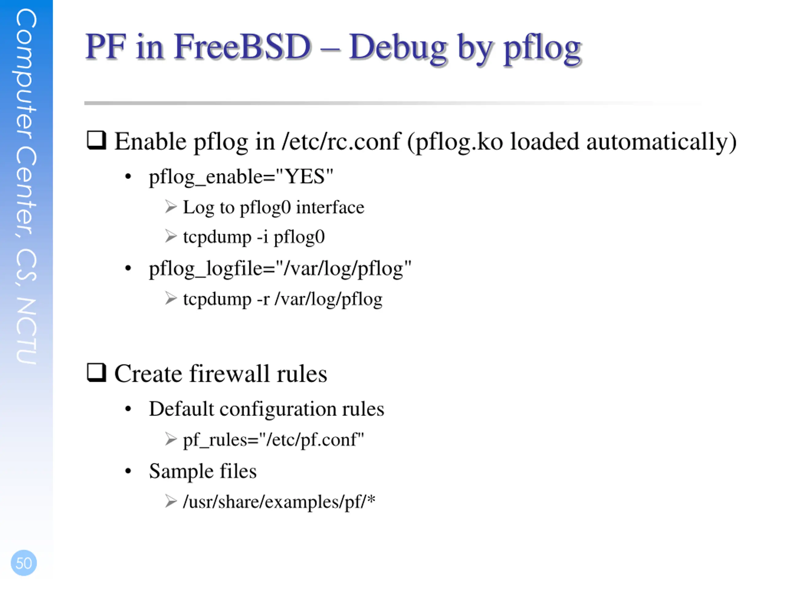 Computer Center, CS, NCTU PF in FreeBSD Debug by pflog Enable pflog in /etc/rc.conf (pflog.ko loaded automatically) pflog_enable="YES" Log to pflog0 interface tcpdump -i pflog0 pflog_logfile="/var/log/pflog" tcpdump -r /var/log/pflog Create firewall rules Default configuration rules pf_rules="/etc/pf.conf" Sample files /usr/share/examples/pf/* 50