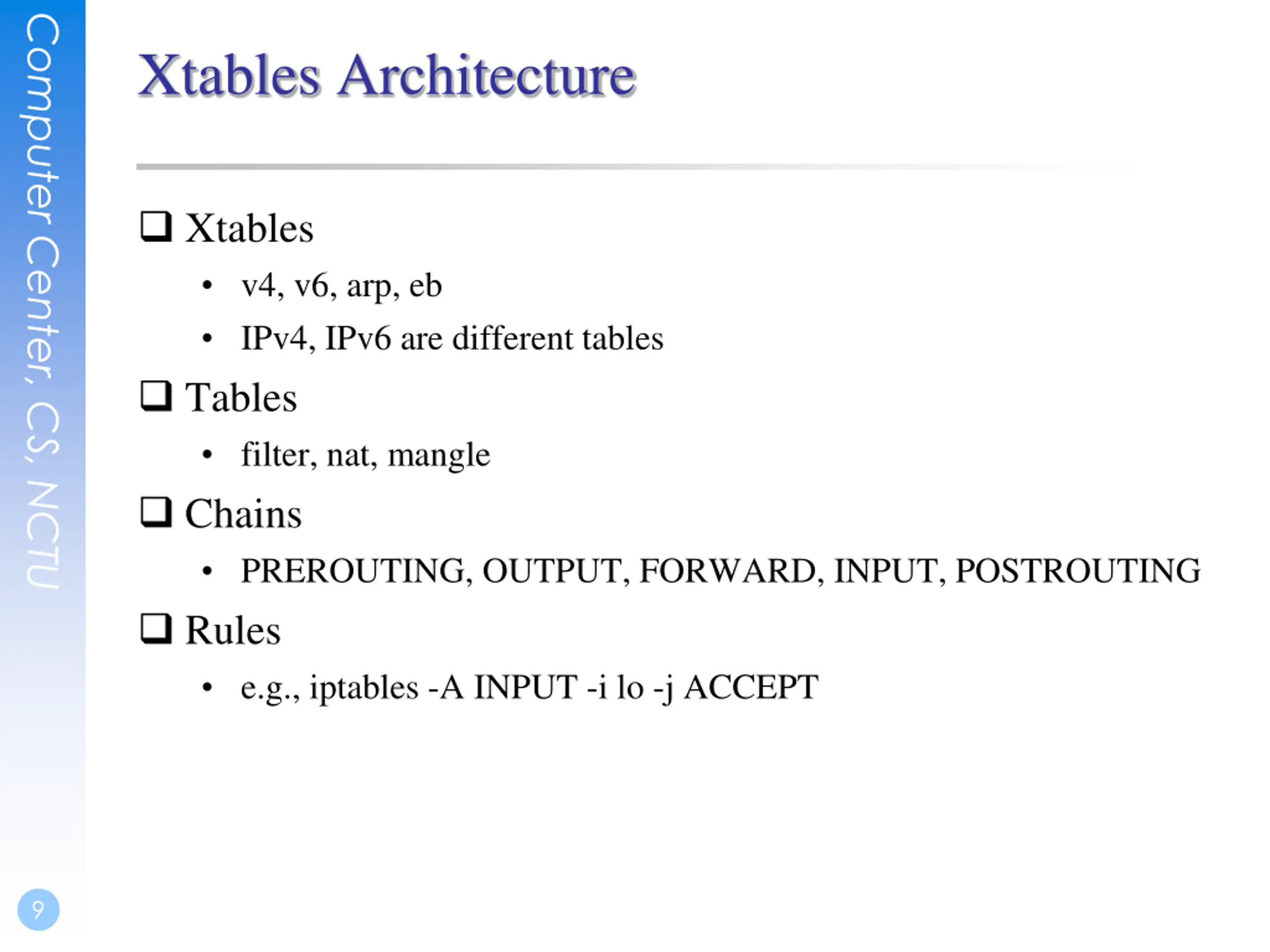 Computer Center, CS, NCTU Xtables Architecture Xtables v4, v6, arp, eb IPv4, IPv6 are different tables Tables filter, nat, mangle Chains PREROUTING, OUTPUT, FORWARD, INPUT, POSTROUTING Rules e.g., iptables -A INPUT -i lo -j ACCEPT 9