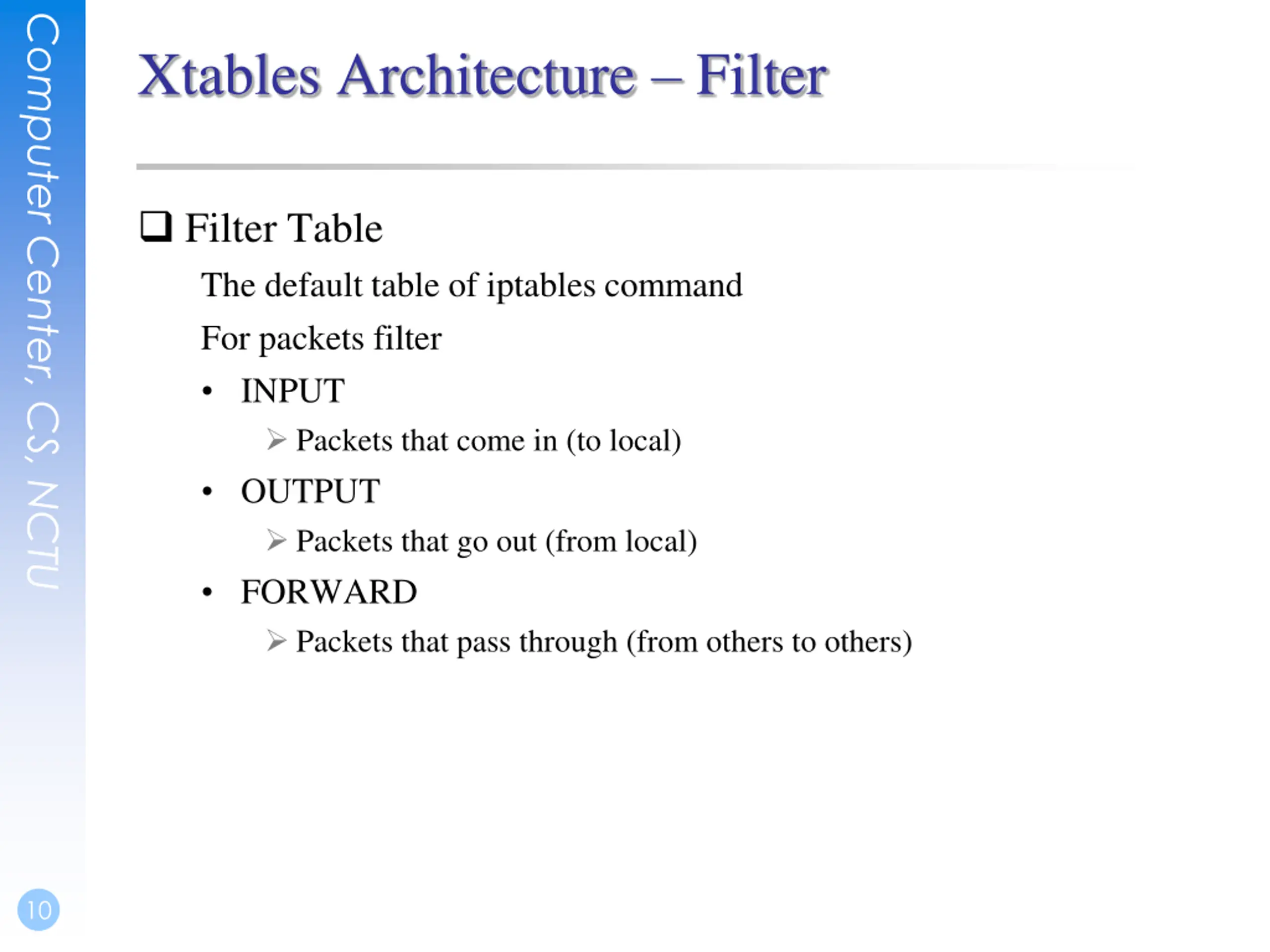 Computer Center, CS, NCTU Xtables Architecture Filter Filter Table The default table of iptables command For packets filter INPUT Packets that come in (to local) OUTPUT Packets that go out (from local) FORWARD Packets that pass through (from others to others) 10