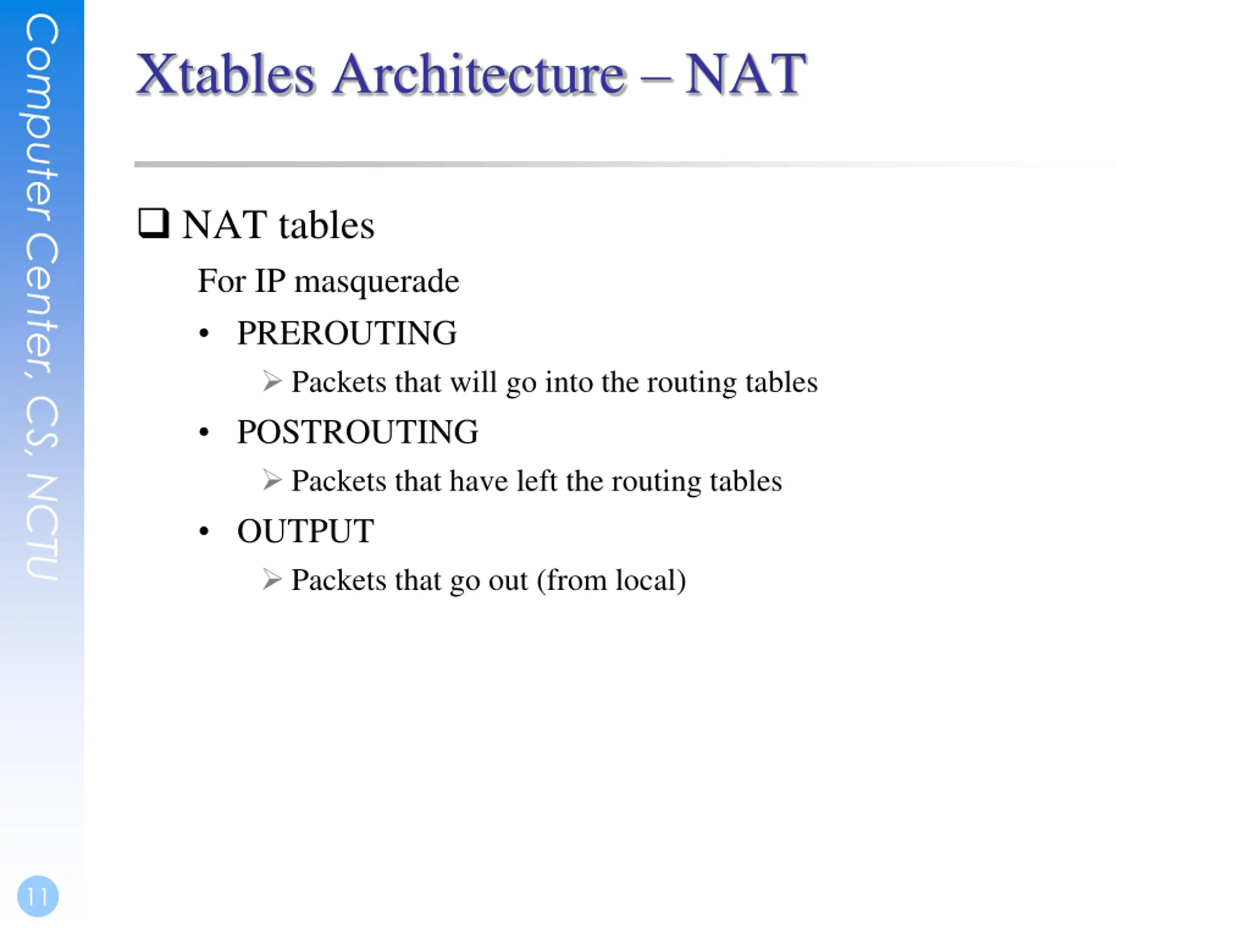 Computer Center, CS, NCTU Xtables Architecture NAT NAT tables For IP masquerade PREROUTING Packets that will go into the routing tables POSTROUTING Packets that have left the routing tables OUTPUT Packets that go out (from local) 11