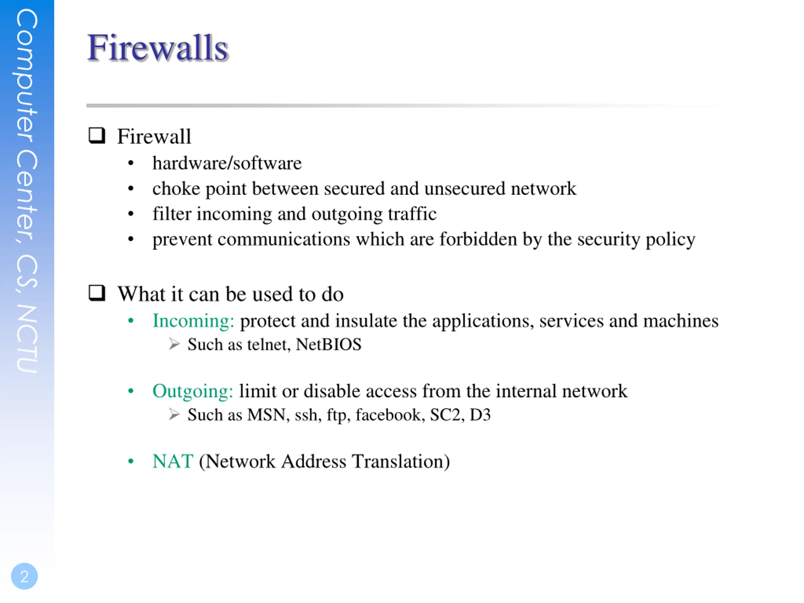 Computer Center, CS, NCTU Firewalls Firewall hardware/software choke point between secured and unsecured network filter incoming and outgoing traffic prevent communications which are forbidden by the security policy What it can be used to do Incoming: protect and insulate the applications, services and machines Such as telnet, NetBIOS Outgoing: limit or disable access from the internal network Such as MSN, ssh, ftp, facebook, SC2, D3 NAT (Network Address Translation) 2