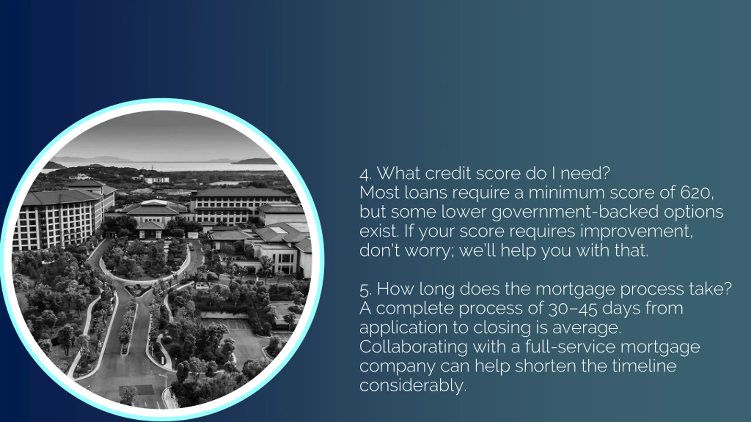 4. What credit score do I need? Most loans require a minimum score of 620, but some lower government-backed options exist. If your score requires improvement, don't worry; we ll help you with that. 5. How long does the mortgage process take? A complete process of 30 45 days from application to closing is average. Collaborating with a full-service mortgage company can help shorten the timeline considerably.