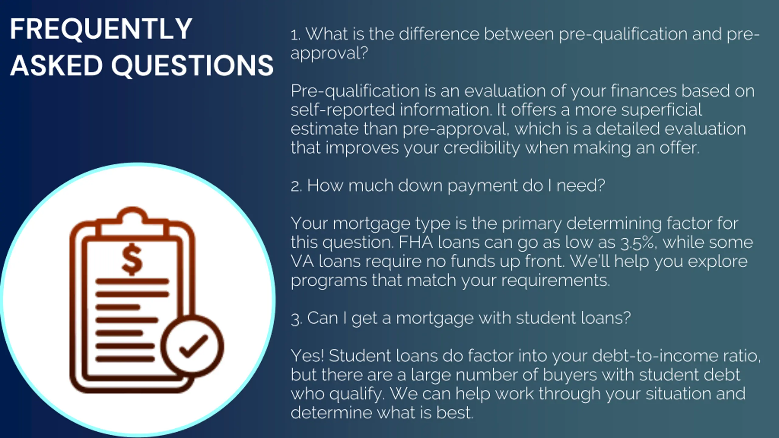 FREQUENTLY ASKED QUESTIONS 1. What is the difference between pre-qualification and pre- approval? Pre-qualification is an evaluation of your finances based on self-reported information. It offers a more superficial estimate than pre-approval, which is a detailed evaluation that improves your credibility when making an offer. 2. How much down payment do I need? Your mortgage type is the primary determining factor for this question. FHA loans can go as low as 3.5%, while some VA loans require no funds up front. We ll help you explore programs that match your requirements. 3. Can I get a mortgage with student loans? Yes! Student loans do factor into your debt-to-income ratio, but there are a large number of buyers with student debt who qualify. We can help work through your situation and determine what is best.