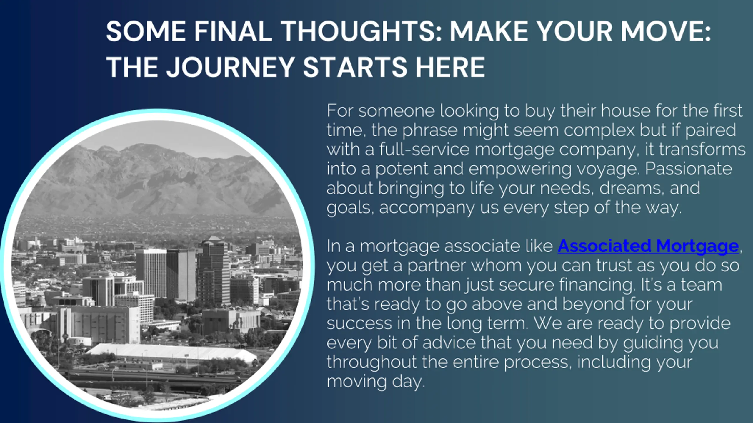 SOME FINAL THOUGHTS: MAKE YOUR MOVE: THE JOURNEY STARTS HERE For someone looking to buy their house for the first time, the phrase might seem complex but if paired with a full-service mortgage company, it transforms into a potent and empowering voyage. Passionate about bringing to life your needs, dreams, and goals, accompany us every step of the way. In a mortgage associate like Associated Mortgage, you get a partner whom you can trust as you do so much more than just secure financing. It s a team that s ready to go above and beyond for your success in the long term. We are ready to provide every bit of advice that you need by guiding you throughout the entire process, including your moving day.