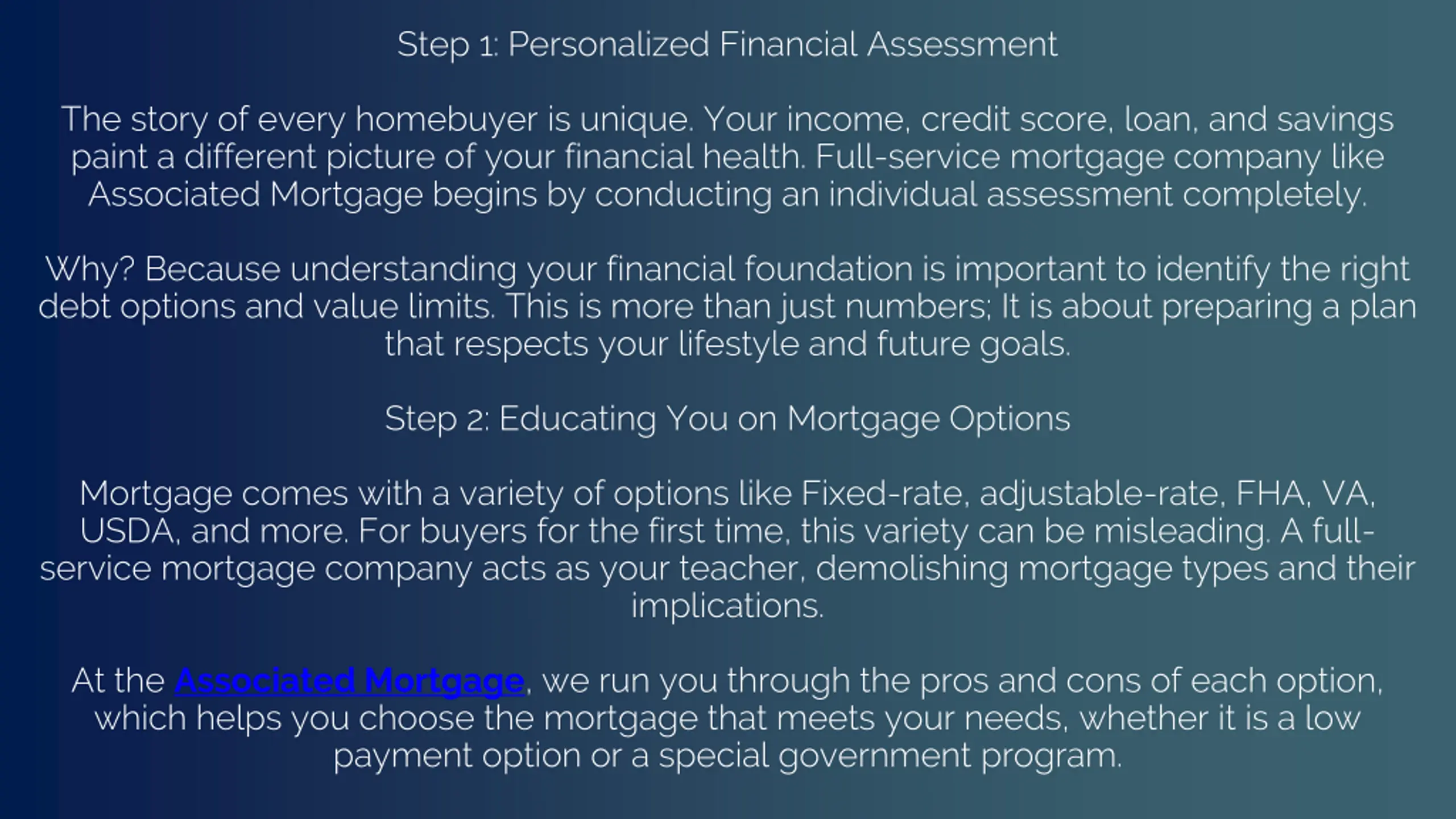Step 1: Personalized Financial Assessment The story of every homebuyer is unique. Your income, credit score, loan, and savings paint a different picture of your financial health. Full-service mortgage company like Associated Mortgage begins by conducting an individual assessment completely. Why? Because understanding your financial foundation is important to identify the right debt options and value limits. This is more than just numbers; It is about preparing a plan that respects your lifestyle and future goals. Step 2: Educating You on Mortgage Options Mortgage comes with a variety of options like Fixed-rate, adjustable-rate, FHA, VA, USDA, and more. For buyers for the first time, this variety can be misleading. A full- service mortgage company acts as your teacher, demolishing mortgage types and their implications. At the Associated Mortgage, we run you through the pros and cons of each option, which helps you choose the mortgage that meets your needs, whether it is a low payment option or a special government program.