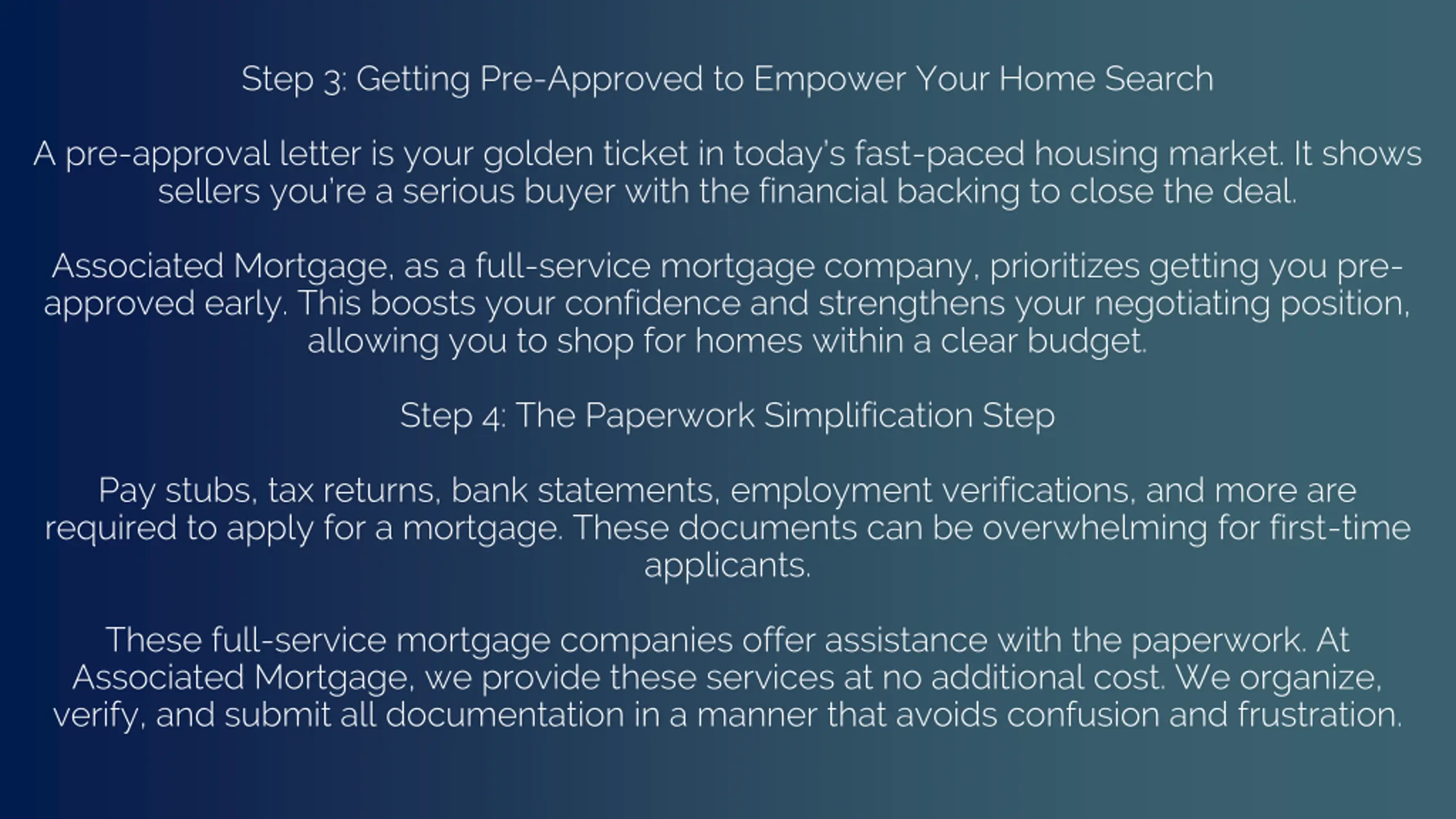 Step 3: Getting Pre-Approved to Empower Your Home Search A pre-approval letter is your golden ticket in today s fast-paced housing market. It shows sellers you re a serious buyer with the financial backing to close the deal. Associated Mortgage, as a full-service mortgage company, prioritizes getting you pre- approved early. This boosts your confidence and strengthens your negotiating position, allowing you to shop for homes within a clear budget. Step 4: The Paperwork Simplification Step Pay stubs, tax returns, bank statements, employment verifications, and more are required to apply for a mortgage. These documents can be overwhelming for first-time applicants. These full-service mortgage companies offer assistance with the paperwork. At Associated Mortgage, we provide these services at no additional cost. We organize, verify, and submit all documentation in a manner that avoids confusion and frustration.