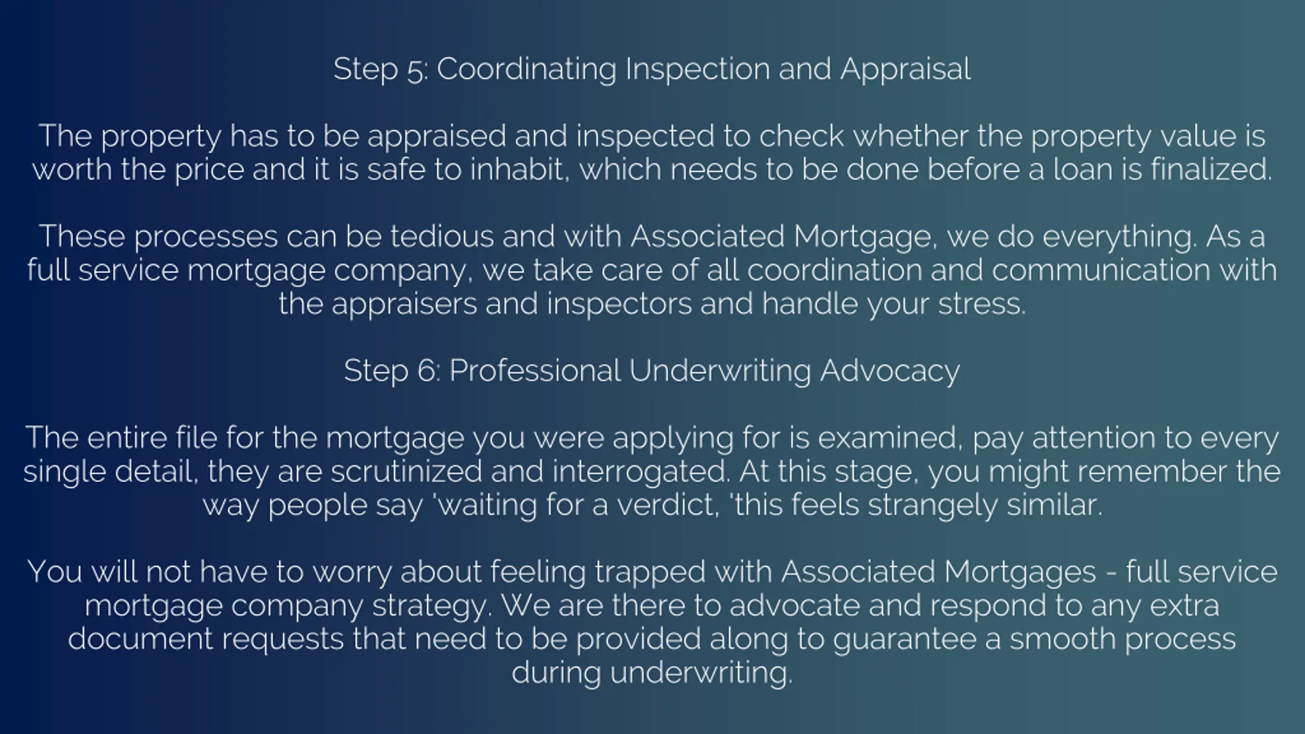 Step 7: Optimistic Closing Signing the documents on the day of the closing appointment marks the end. A full- service company assists you with understanding each document in detail before any signatures are placed. Associated Mortgage goes over your Closing Disclosure with you, explaining all costs and payments, and makes sure the last step is completed with no stress at all.