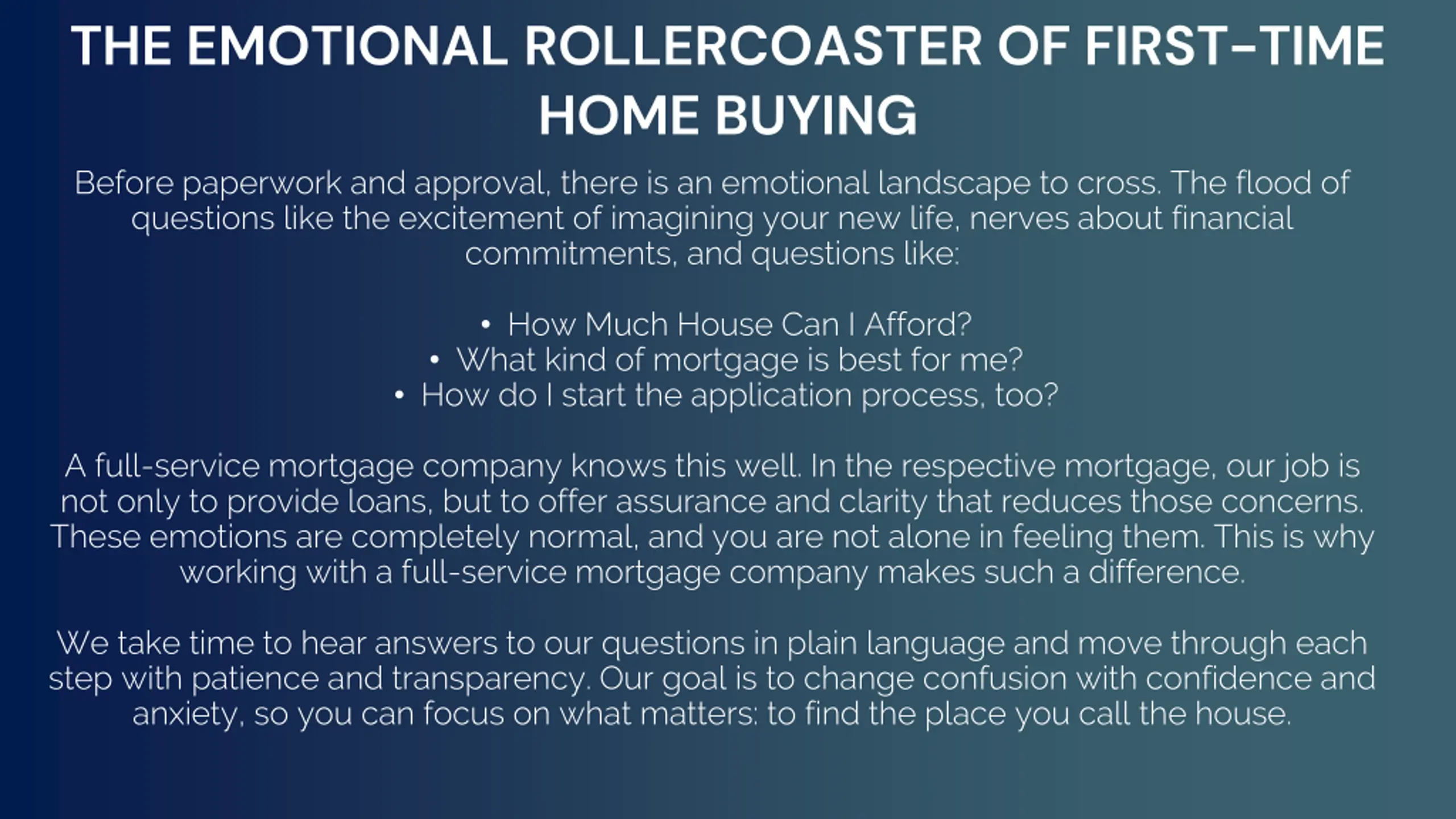 THE EMOTIONAL ROLLERCOASTER OF FIRST-TIME HOME BUYING Before paperwork and approval, there is an emotional landscape to cross. The flood of questions like the excitement of imagining your new life, nerves about financial commitments, and questions like: How Much House Can I Afford? What kind of mortgage is best for me? How do I start the application process, too? A full-service mortgage company knows this well. In the respective mortgage, our job is not only to provide loans, but to offer assurance and clarity that reduces those concerns. These emotions are completely normal, and you are not alone in feeling them. This is why working with a full-service mortgage company makes such a difference. We take time to hear answers to our questions in plain language and move through each step with patience and transparency. Our goal is to change confusion with confidence and anxiety, so you can focus on what matters: to find the place you call the house.