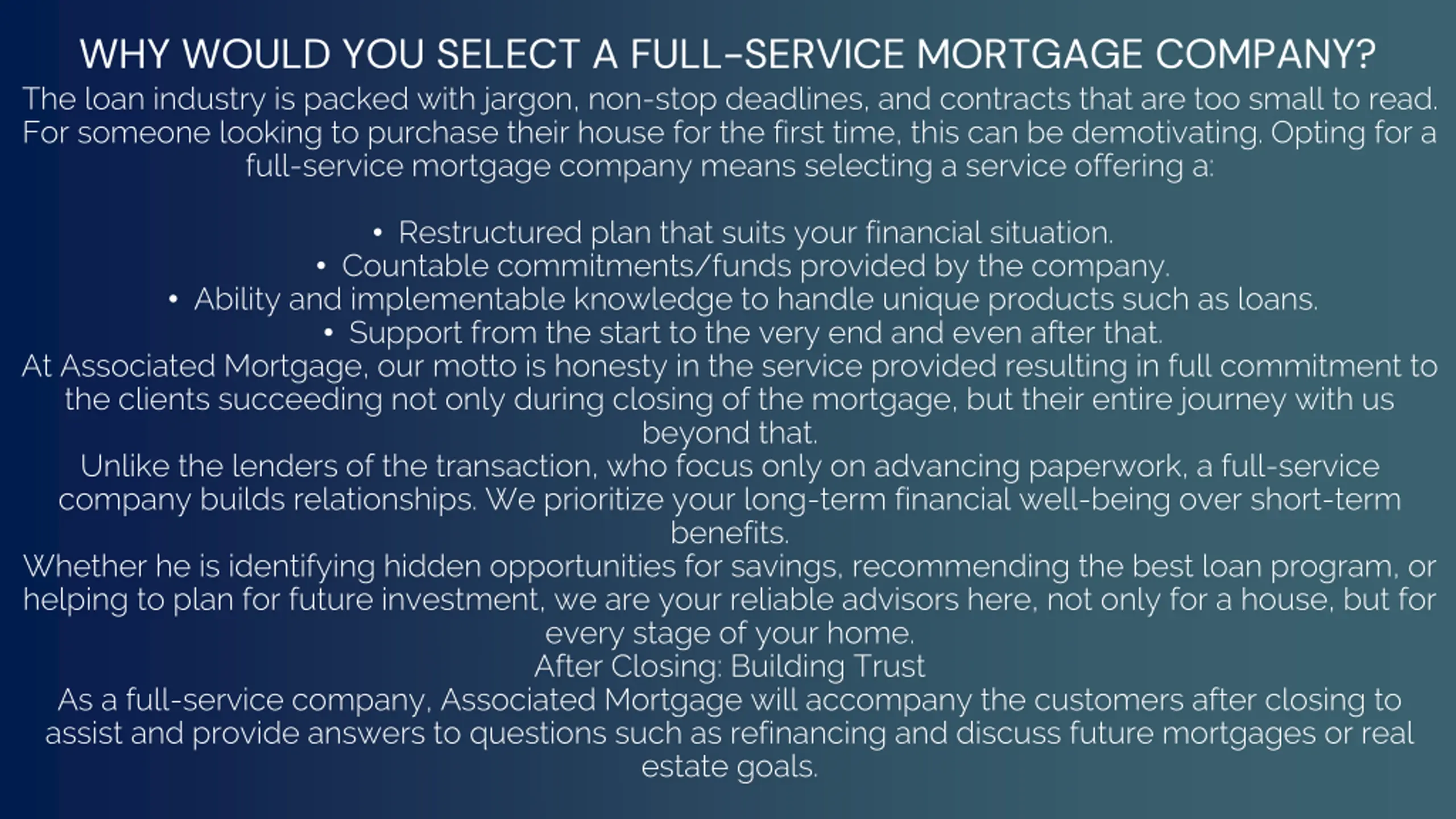 WHY WOULD YOU SELECT A FULL-SERVICE MORTGAGE COMPANY? The loan industry is packed with jargon, non-stop deadlines, and contracts that are too small to read. For someone looking to purchase their house for the first time, this can be demotivating. Opting for a full-service mortgage company means selecting a service offering a: Restructured plan that suits your financial situation. Countable commitments/funds provided by the company. Ability and implementable knowledge to handle unique products such as loans. Support from the start to the very end and even after that. At Associated Mortgage, our motto is honesty in the service provided resulting in full commitment to the clients succeeding not only during closing of the mortgage, but their entire journey with us beyond that. Unlike the lenders of the transaction, who focus only on advancing paperwork, a full-service company builds relationships. We prioritize your long-term financial well-being over short-term benefits. Whether he is identifying hidden opportunities for savings, recommending the best loan program, or helping to plan for future investment, we are your reliable advisors here, not only for a house, but for every stage of your home. After Closing: Building Trust As a full-service company, Associated Mortgage will accompany the customers after closing to assist and provide answers to questions such as refinancing and discuss future mortgages or real estate goals.