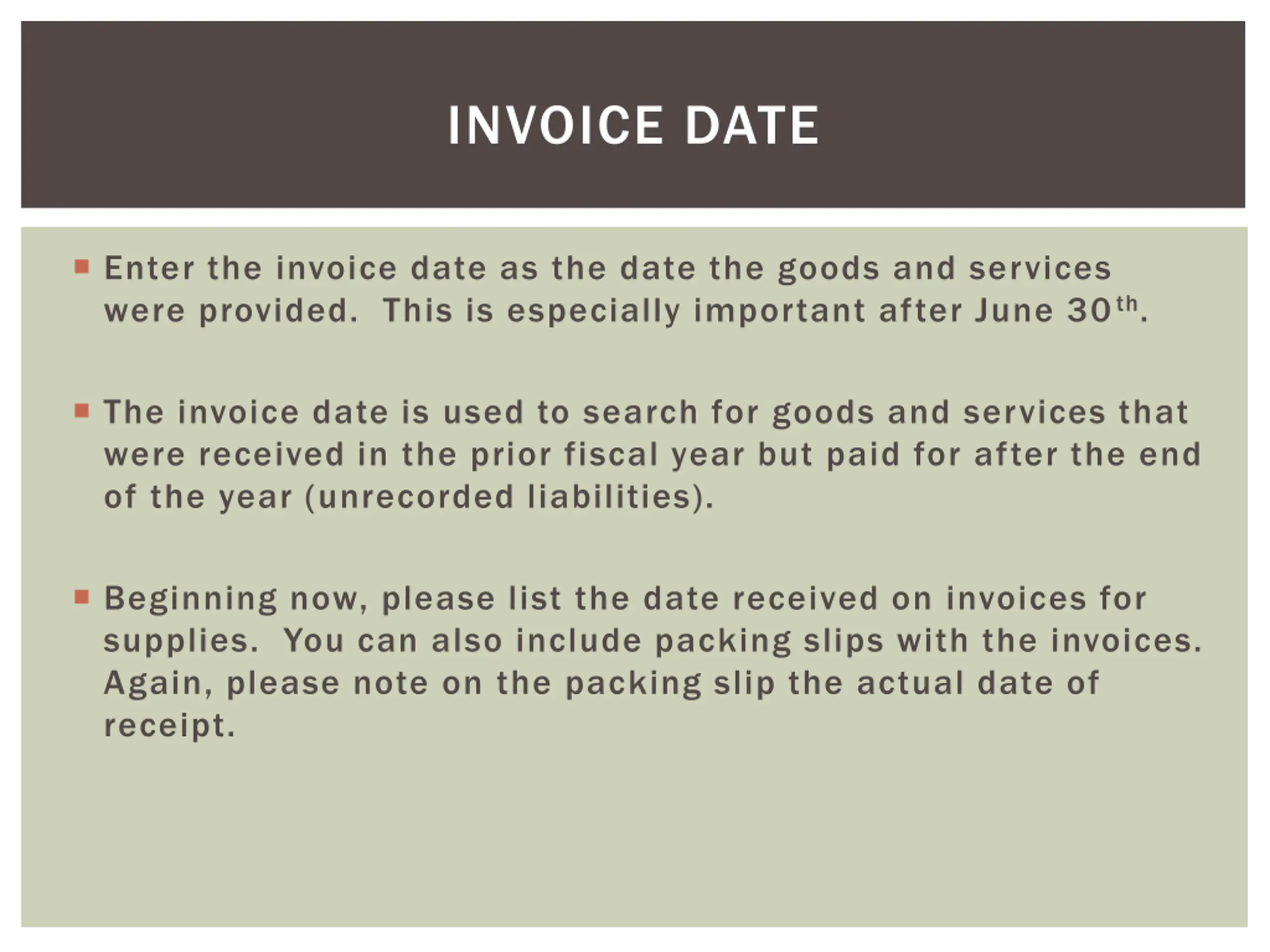 INVOICE DATE Enter the invoice date as the date the goods and services were provided. This is especially important after June 30th. The invoice date is used to search for goods and services that were received in the prior fiscal year but paid for after the end of the year (unrecorded liabilities). Beginning now, please list the date received on invoices for supplies. You can also include packing slips with the invoices. Again, please note on the packing slip the actual date of receipt.
