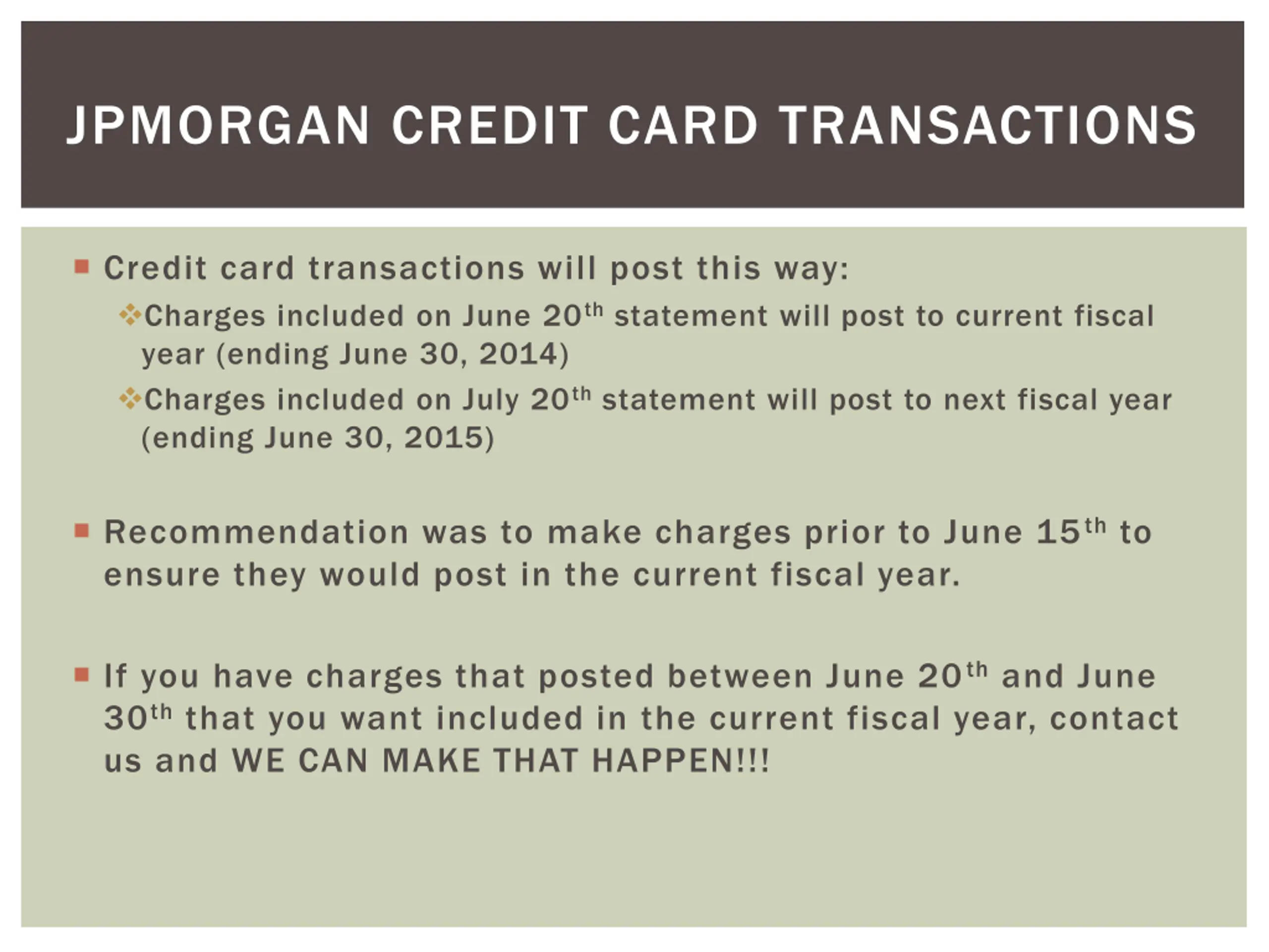 JPMORGAN CREDIT CARD TRANSACTIONS Credit card transactions will post this way: Charges included on June 20thstatement will post to current fiscal year (ending June 30, 2014) Charges included on July 20thstatement will post to next fiscal year (ending June 30, 2015) Recommendation was to make charges prior to June 15thto ensure they would post in the current fiscal year. If you have charges that posted between June 20thand June 30ththat you want included in the current fiscal year, contact us and WE CAN MAKE THAT HAPPEN!!!