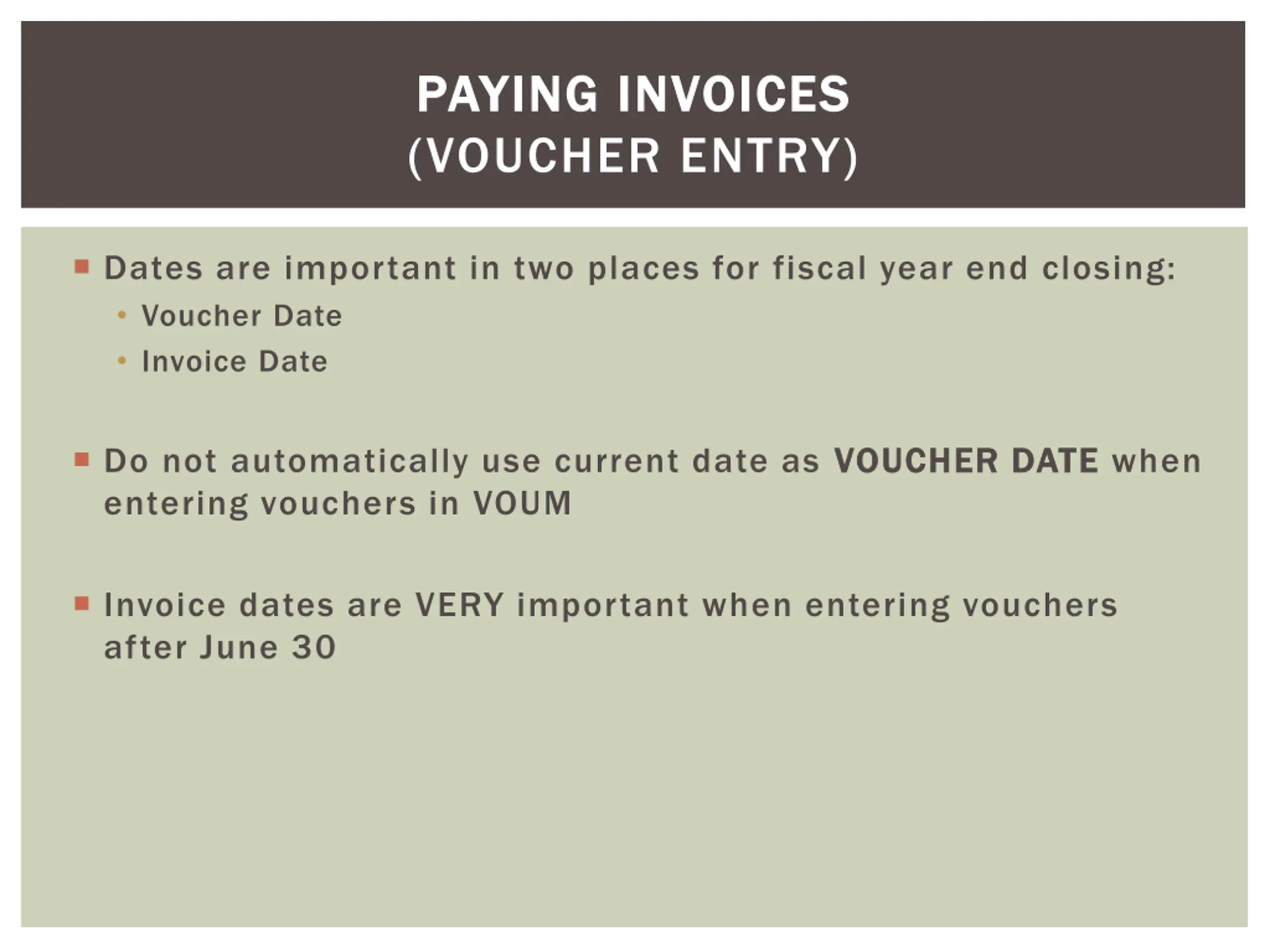PAYING INVOICES PAYING INVOICES (VOUCHER ENTRY) Dates are important in two places for fiscal year end closing: Voucher Date Invoice Date Do not automatically use current date as VOUCHER DATE entering vouchers in VOUM VOUCHER DATE when Invoice dates are VERY important when entering vouchers after June 30