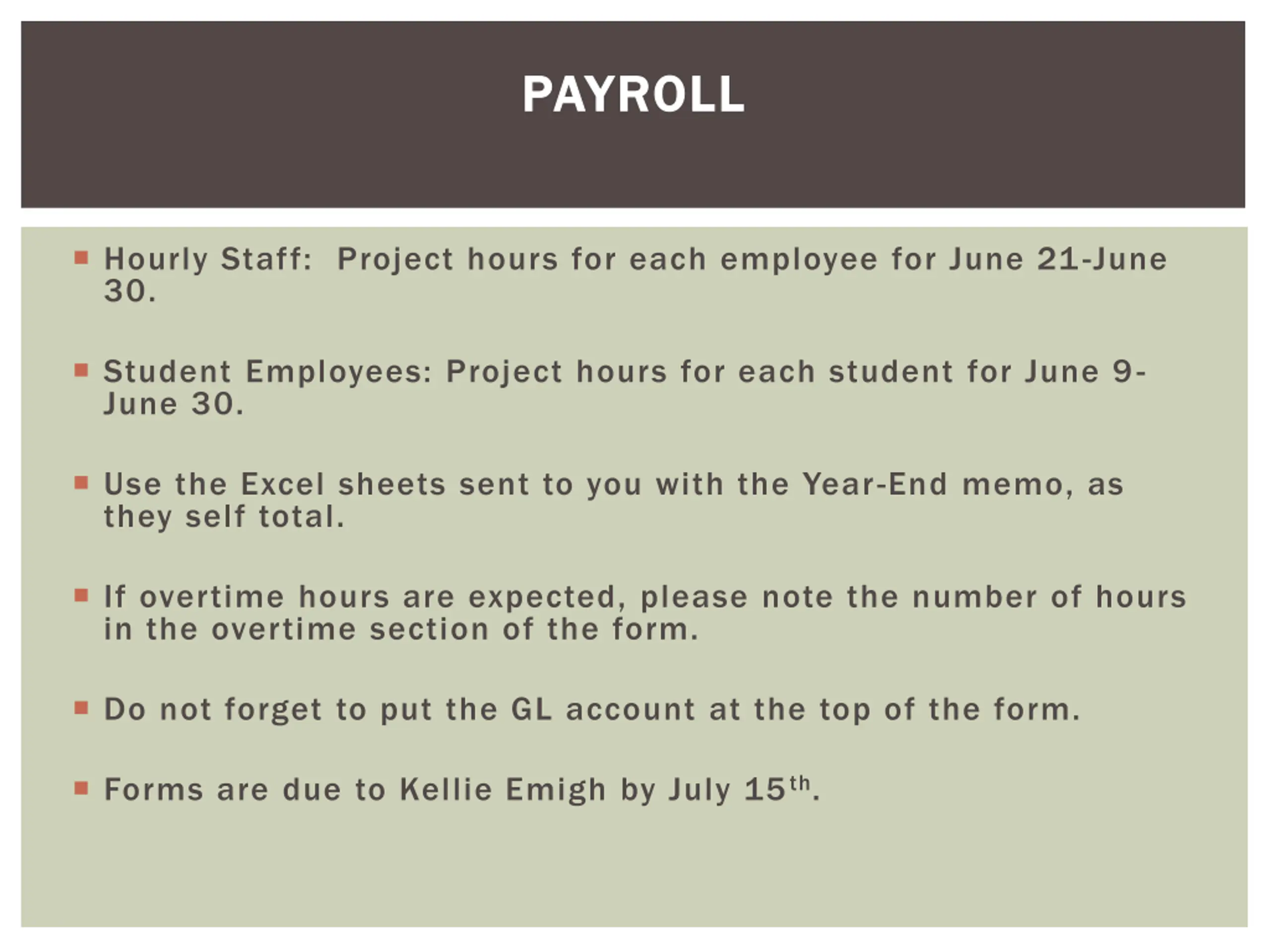 PAYROLL PAYROLL Hourly Staff: Project hours for each employee for June 21-June 30. Student Employees: Project hours for each student for June 9- June 30. Use the Excel sheets sent to you with the Year-End memo, as they self total. If overtime hours are expected, please note the number of hours in the overtime section of the form. Do not forget to put the GL account at the top of the form. Forms are due to Kellie Emigh by July 15th.