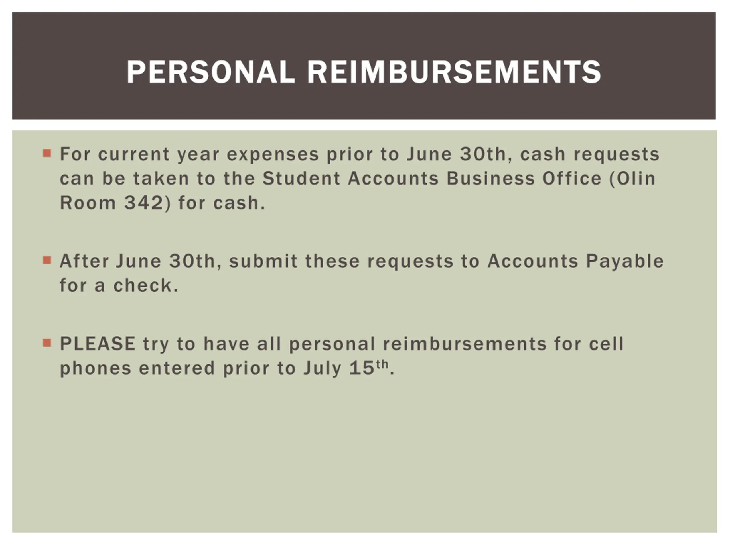 PERSONAL REIMBURSEMENTS PERSONAL REIMBURSEMENTS For current year expenses prior to June 30th, cash requests can be taken to the Student Accounts Business Office (Olin Room 342) for cash. After June 30th, submit these requests to Accounts Payable for a check. PLEASE try to have all personal reimbursements for cell phones entered prior to July 15th.