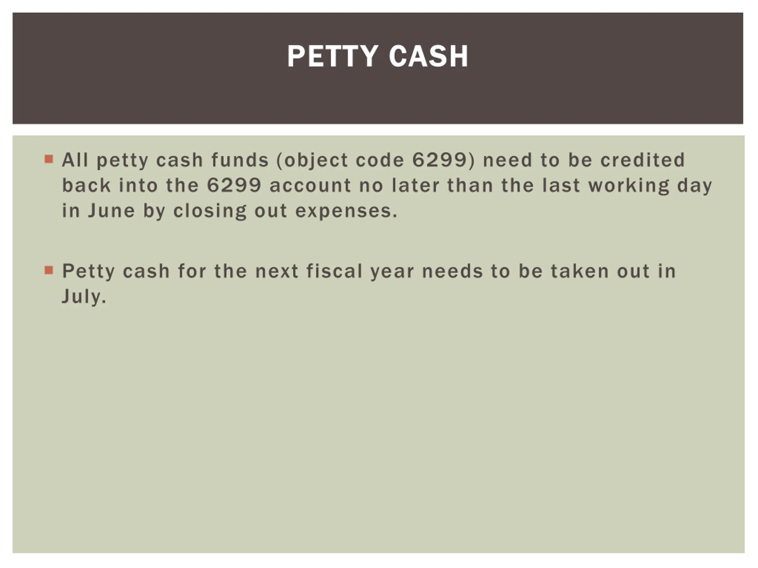 PETTY CASH PETTY CASH All petty cash funds (object code 6299) need to be credited back into the 6299 account no later than the last working day in June by closing out expenses. Petty cash for the next fiscal year needs to be taken out in July.