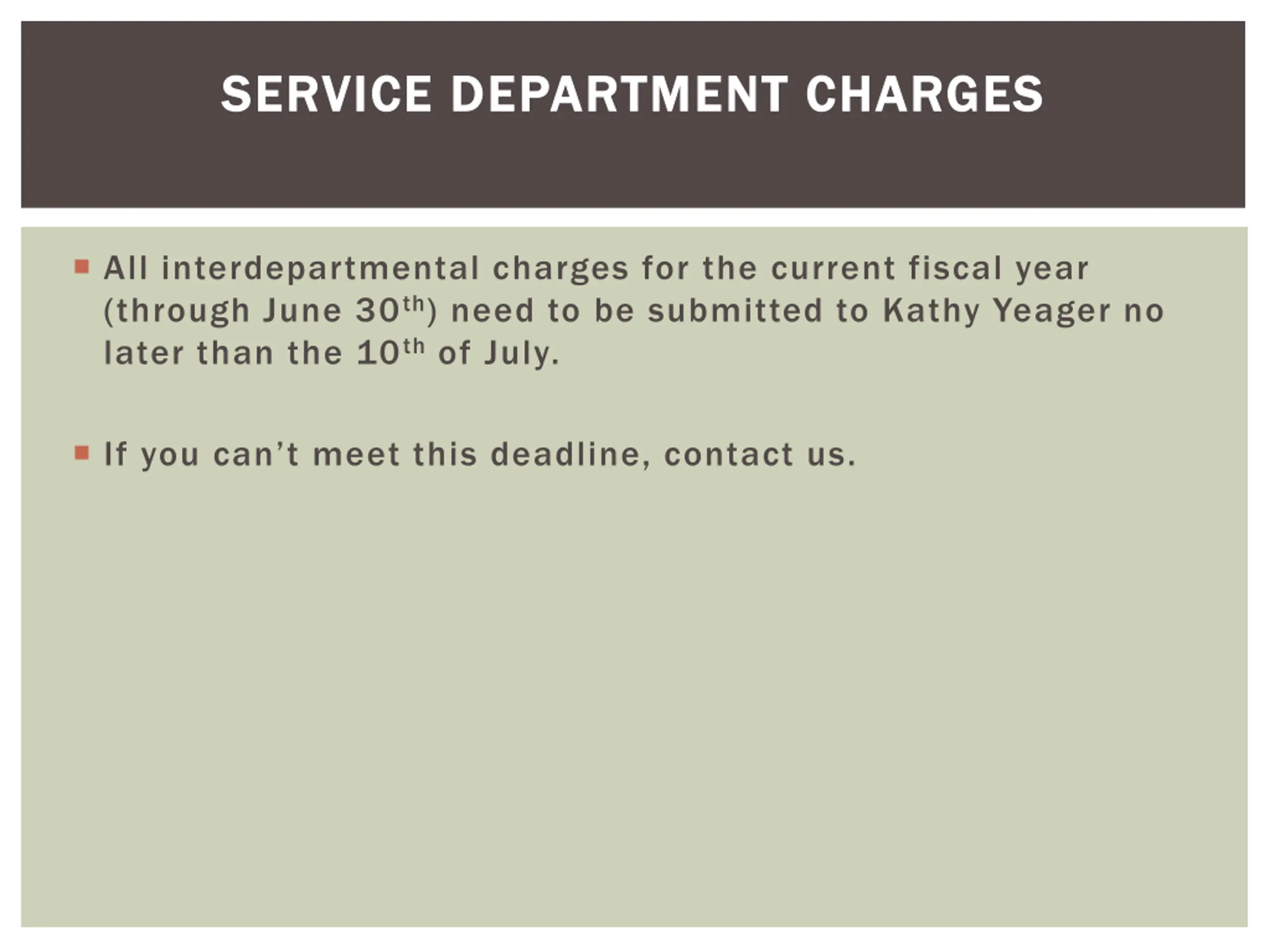 SERVICE DEPARTMENT CHARGES SERVICE DEPARTMENT CHARGES All interdepartmental charges for the current fiscal year (through June 30th) need to be submitted to Kathy Yeager no later than the 10thof July. If you can t meet this deadline, contact us.
