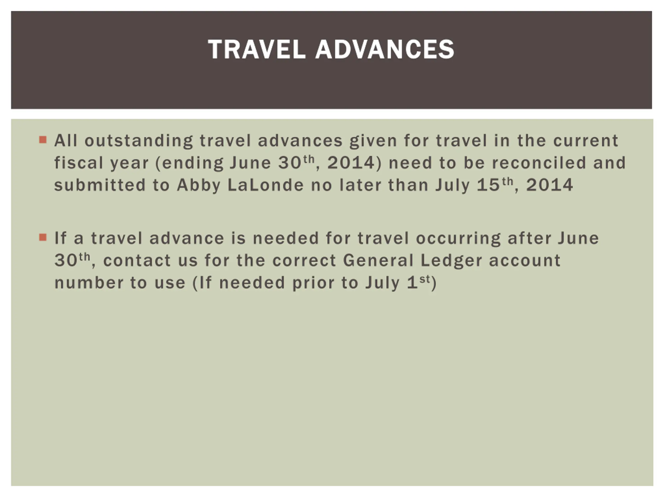 TRAVEL ADVANCES TRAVEL ADVANCES All outstanding travel advances given for travel in the current fiscal year (ending June 30th, 2014) need to be reconciled and submitted to Abby LaLonde no later than July 15th, 2014 If a travel advance is needed for travel occurring after June 30th, contact us for the correct General Ledger account number to use (If needed prior to July 1st)