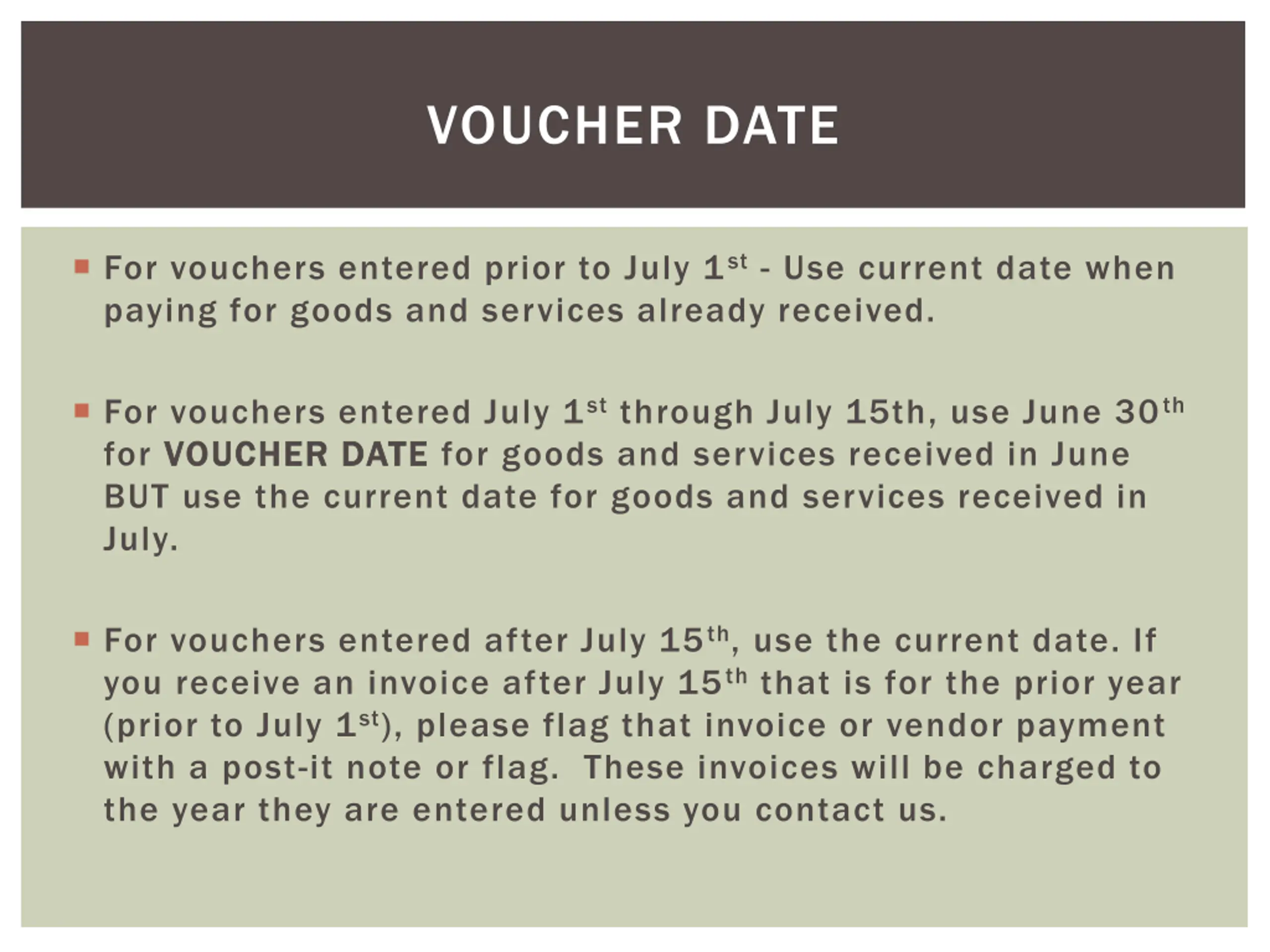 VOUCHER DATE For vouchers entered prior to July 1st- Use current date when paying for goods and services already received. For vouchers entered July 1stthrough July 15th, use June 30th for VOUCHER DATE VOUCHER DATE for goods and services received in June BUT use the current date for goods and services received in July. For vouchers entered after July 15th, use the current date. If you receive an invoice after July 15ththat is for the prior year (prior to July 1st), please flag that invoice or vendor payment with a post-it note or flag. These invoices will be charged to the year they are entered unless you contact us.