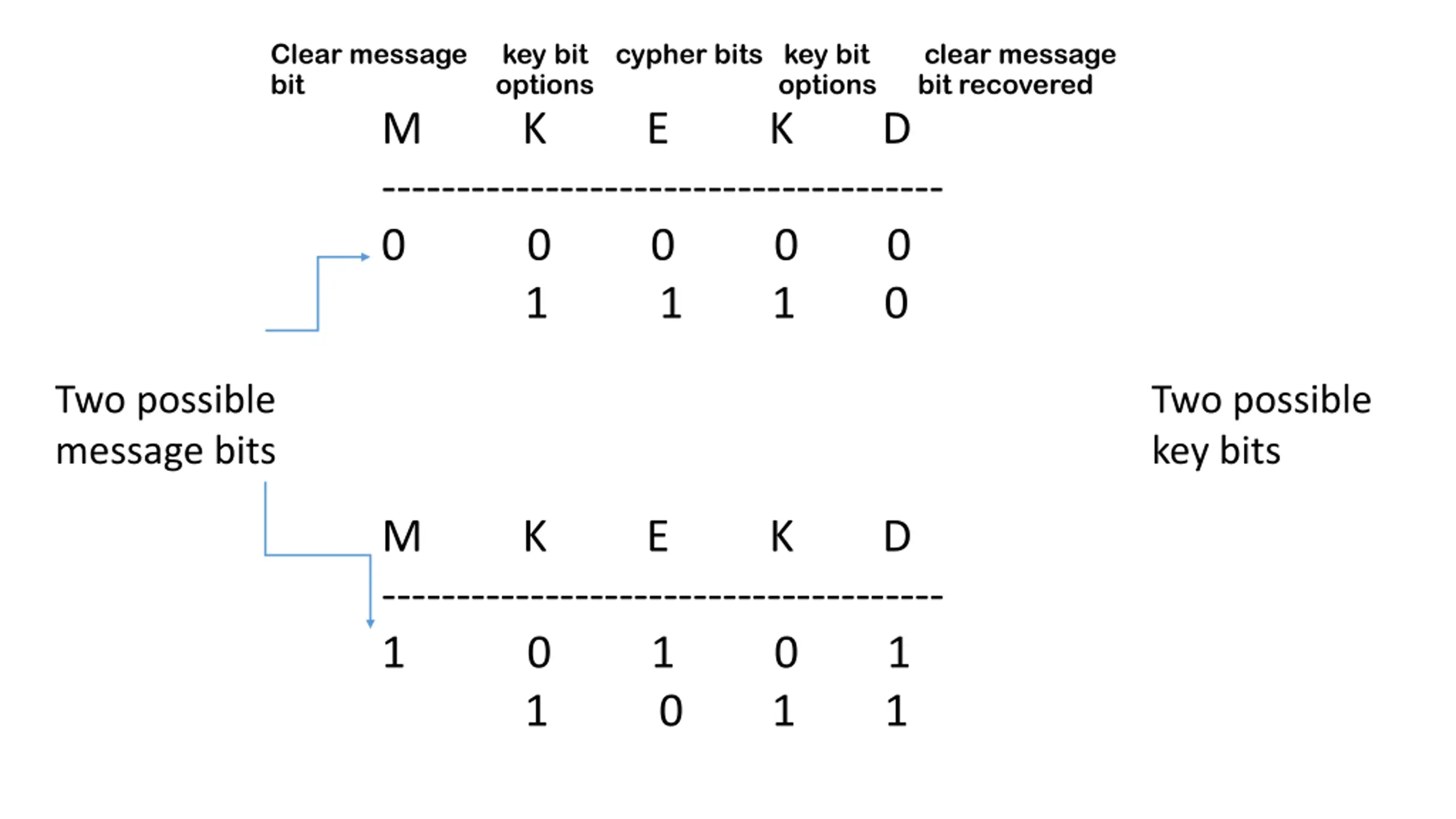 Clear message key bit cypher bits key bit clear message bit options options bit recovered M K E K D -------------------------------------- 0 0 0 0 0 1 1 1 0 Two possible message bits Two possible key bits M K E K D -------------------------------------- 1 0 1 0 1 1 0 1 1