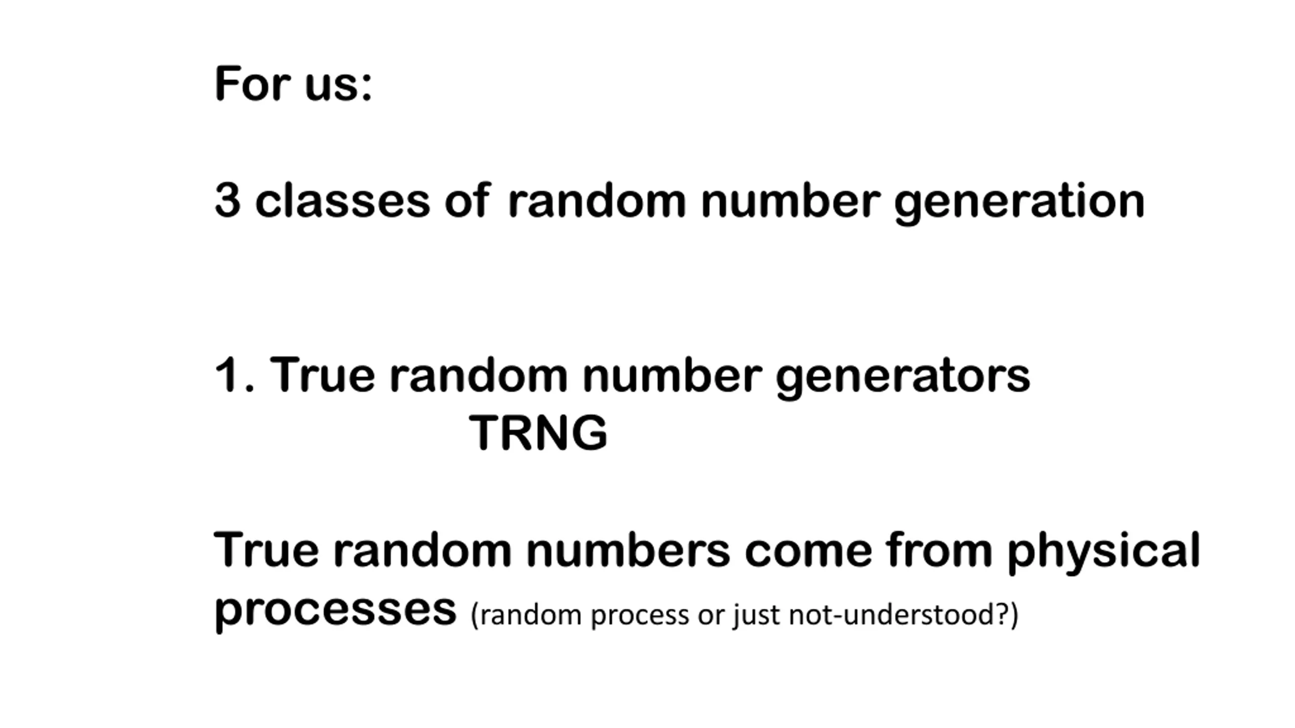 For us: 3 classes of random number generation 1. True random number generators TRNG True random numbers come from physical processes (random process or just not-understood?)