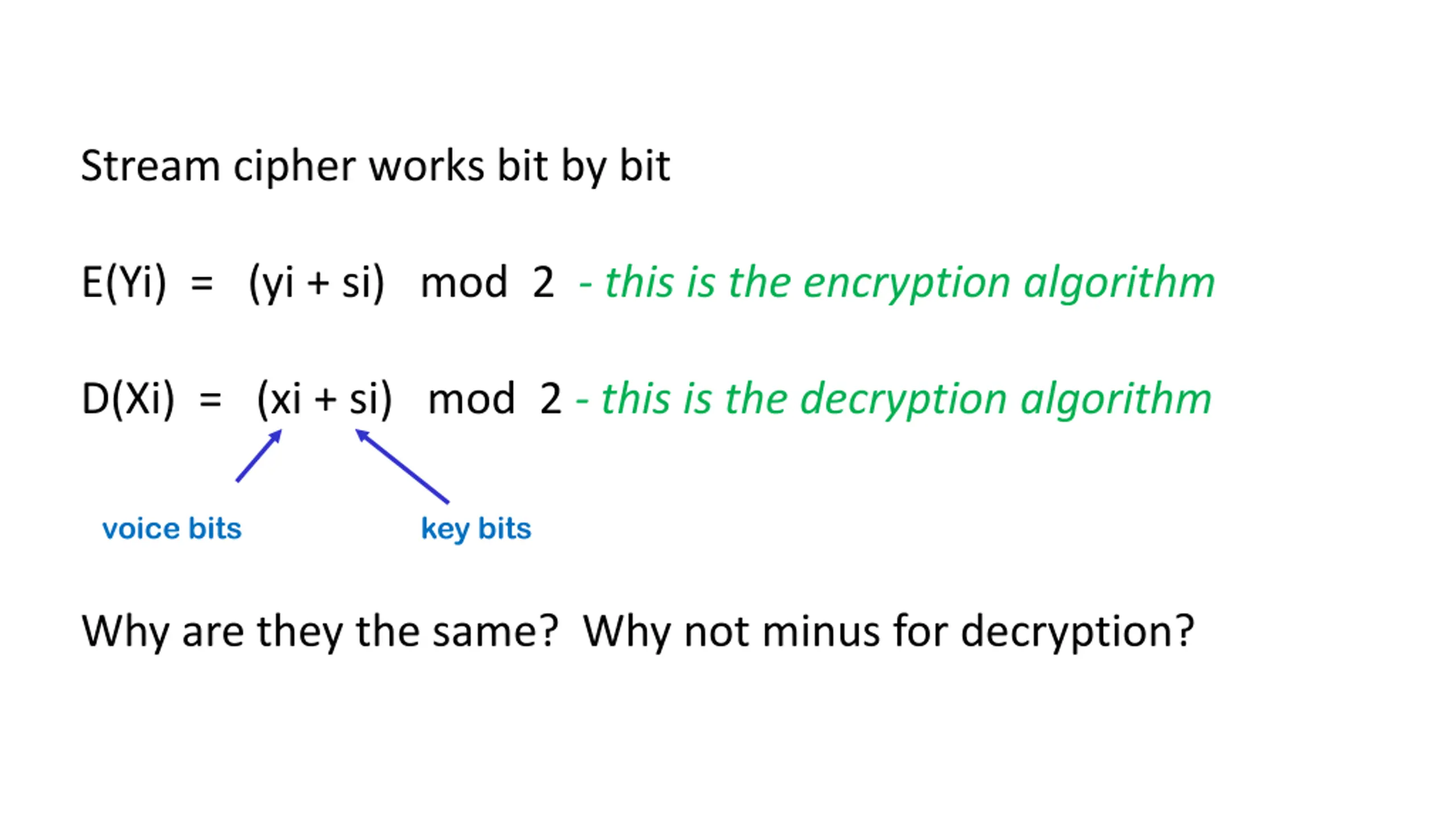 Stream cipher works bit by bit E(Yi) = (yi + si) mod 2 - this is the encryption algorithm D(Xi) = (xi + si) mod 2 - this is the decryption algorithm voice bits key bits Why are they the same? Why not minus for decryption?
