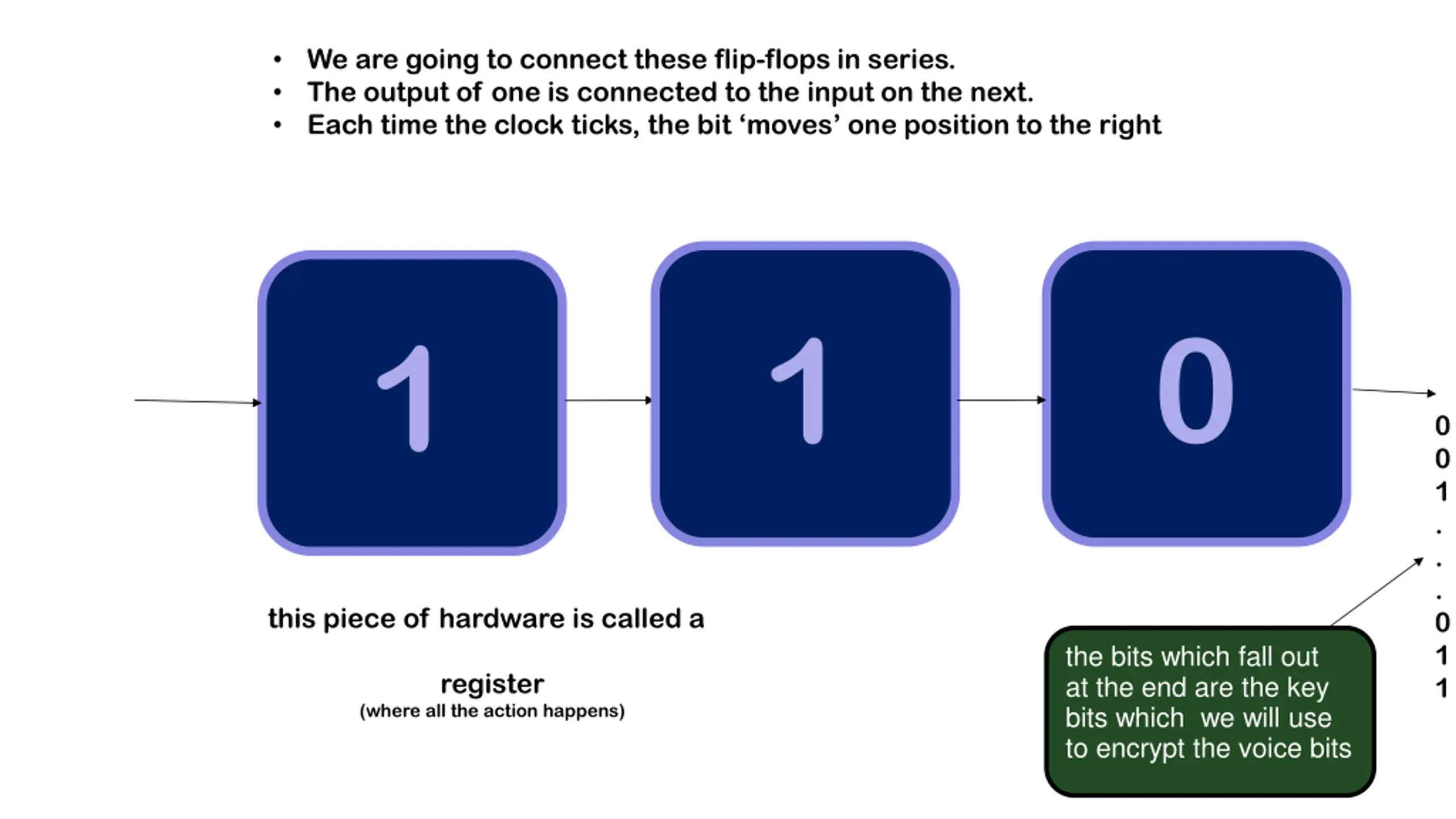We are going to connect these flip-flops in series. The output of one is connected to the input on the next. Each time the clock ticks, the bit moves one position to the right 1 0 1 0 0 1 . . . 0 1 1 this piece of hardware is called a the bits which fall out at the end are the key bits which we will use to encrypt the voice bits register (where all the action happens)