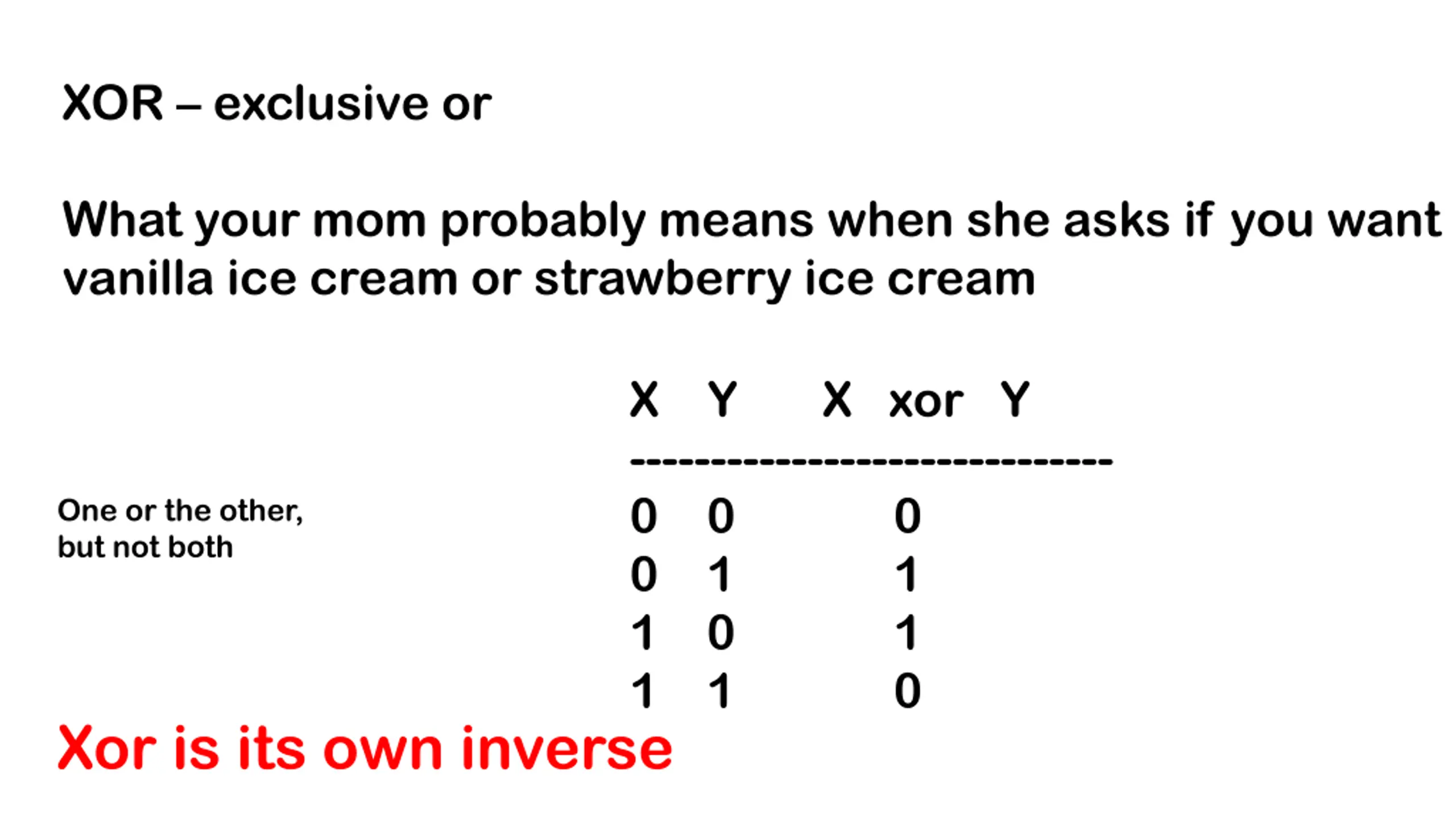 XOR exclusive or What your mom probably means when she asks if you want vanilla ice cream or strawberry ice cream X Y X xor Y ------------------------------ 0 0 0 0 1 1 1 0 1 1 1 0 One or the other, but not both Xor is its own inverse