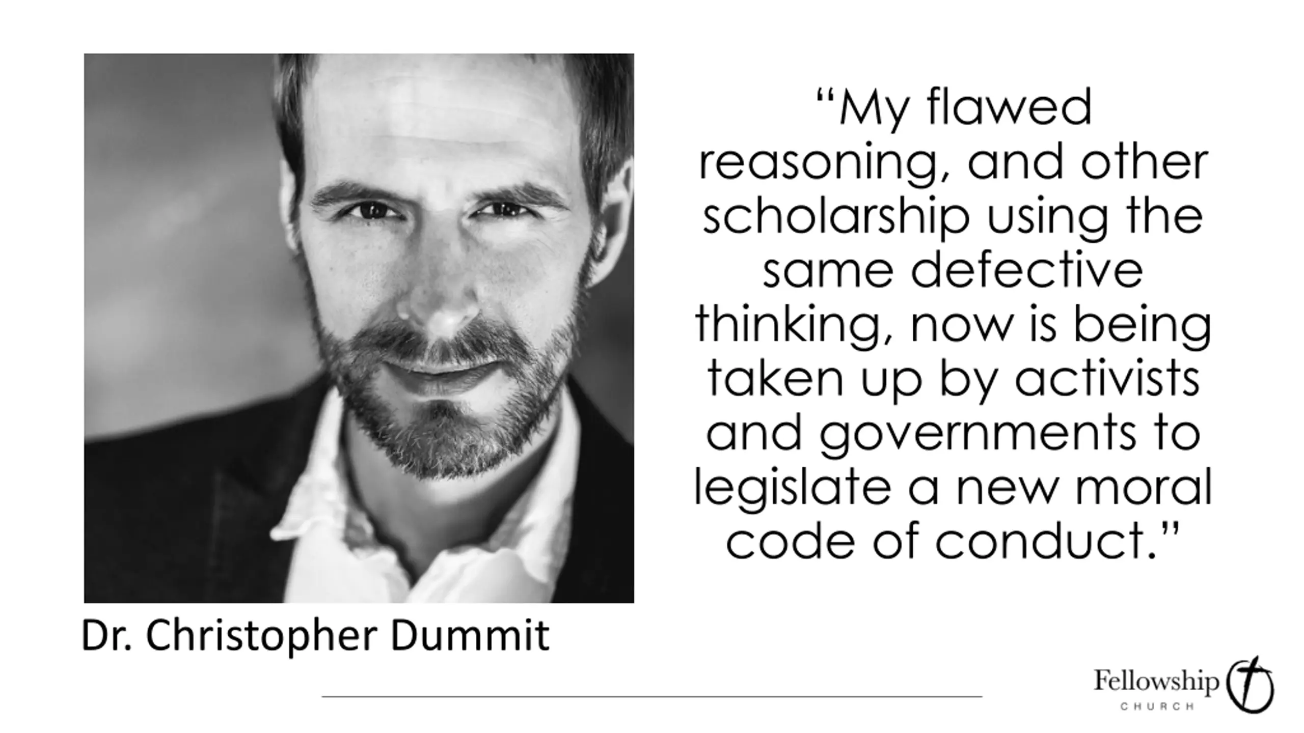 My flawed reasoning, and other scholarship using the same defective thinking, now is being taken up by activists and governments to legislate a new moral code of conduct. Dr. Christopher Dummit