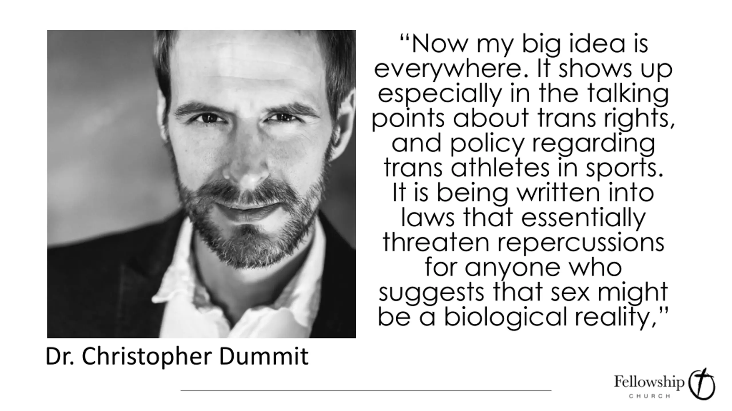 Now my big idea is everywhere. It shows up especially in the talking points about trans rights, and policy regarding trans athletes in sports. It is being written into laws that essentially threaten repercussions for anyone who suggests that sex might be a biological reality, Dr. Christopher Dummit