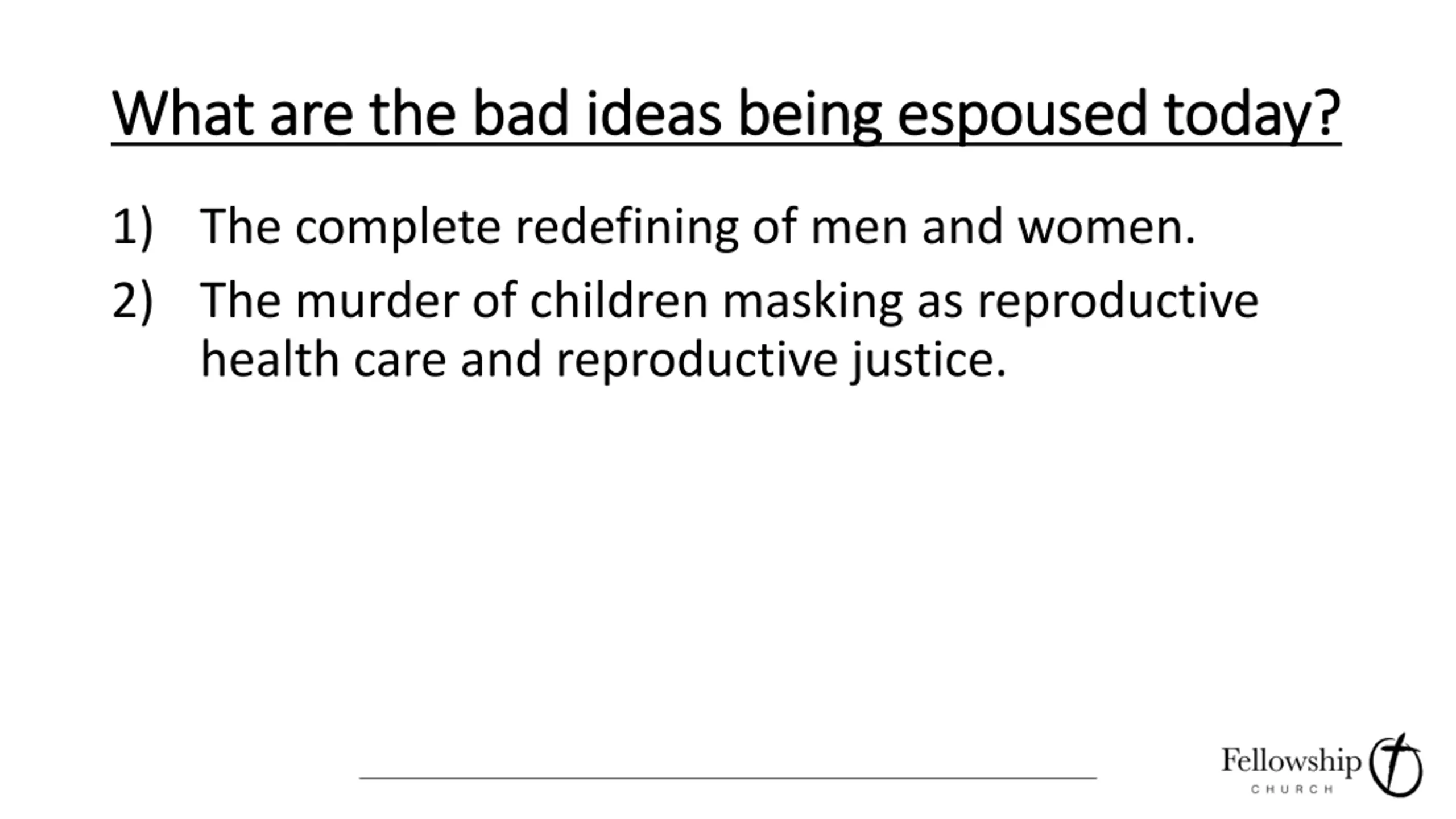 What are the bad ideas being espoused today? What are the bad ideas being espoused today? 1) The complete redefining of men and women. 2) The murder of children masking as reproductive health care and reproductive justice.