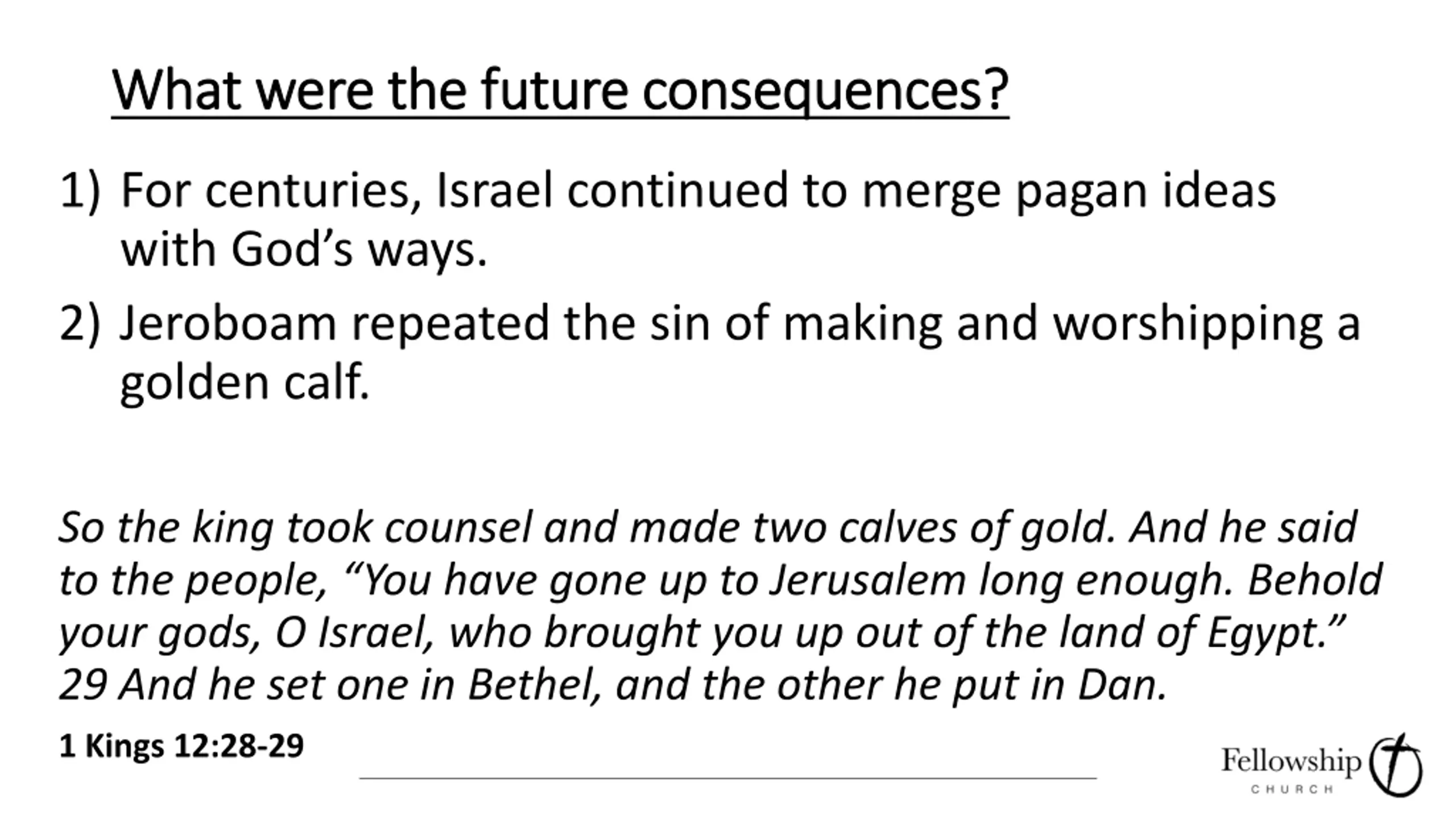 What were the future consequences? What were the future consequences? 1) For centuries, Israel continued to merge pagan ideas with God s ways. 2) Jeroboam repeated the sin of making and worshipping a golden calf.