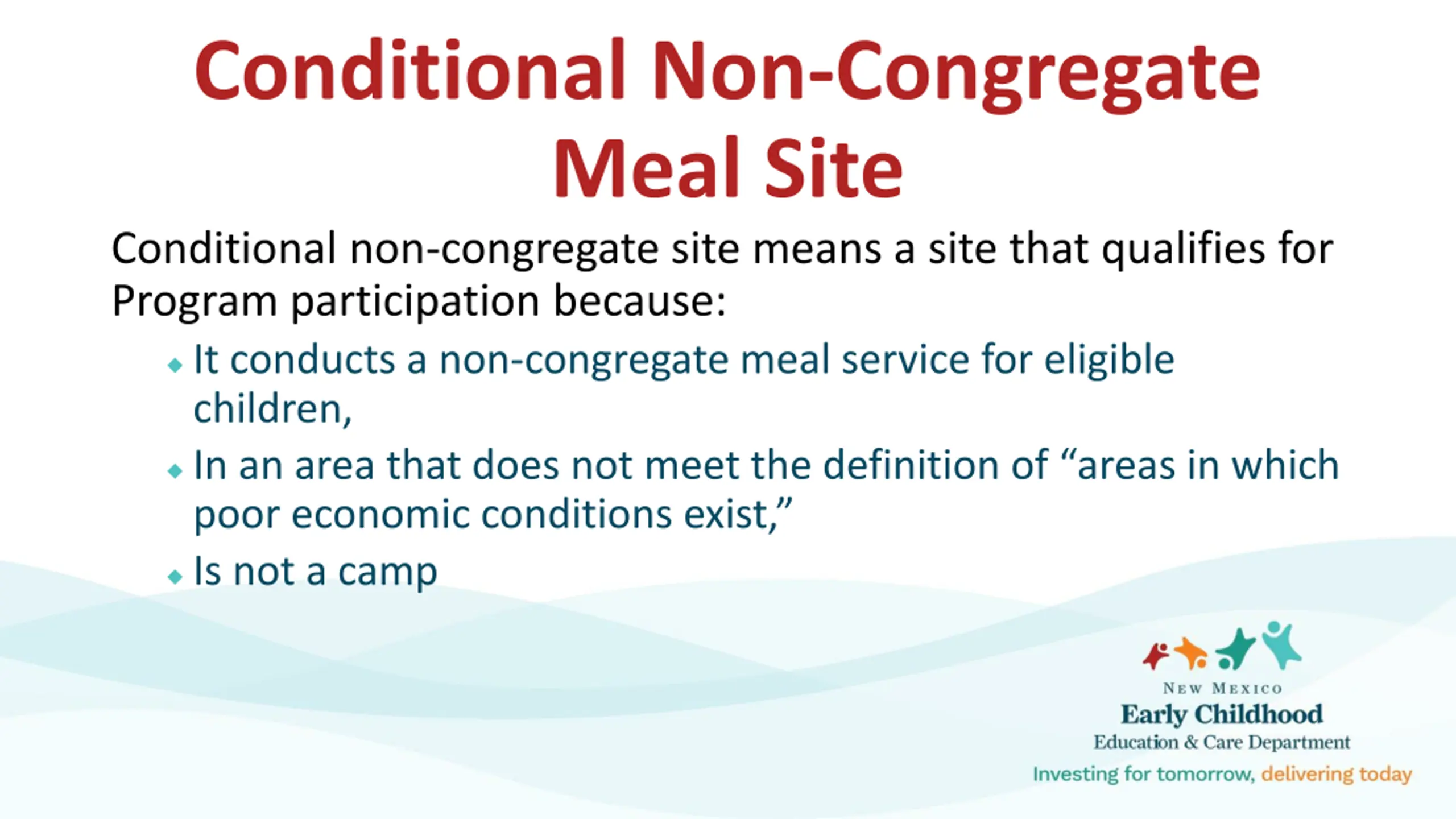 Conditional Non-Congregate Meal Site Conditional non-congregate site means a site that qualifies for Program participation because: It conducts a non-congregate meal service for eligible children, In an area that does not meet the definition of areas in which poor economic conditions exist, Is not a camp