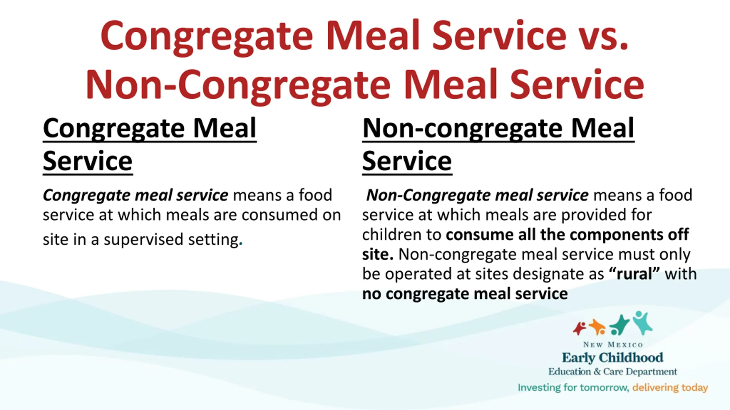 Congregate Meal Service vs. Non-Congregate Meal Service Congregate Meal Service Non-congregate Meal Service Congregate meal service means a food service at which meals are consumed on site in a supervised setting. Non-Congregate meal service means a food service at which meals are provided for children to consume all the components off site. Non-congregate meal service must only be operated at sites designate as rural with no congregate meal service