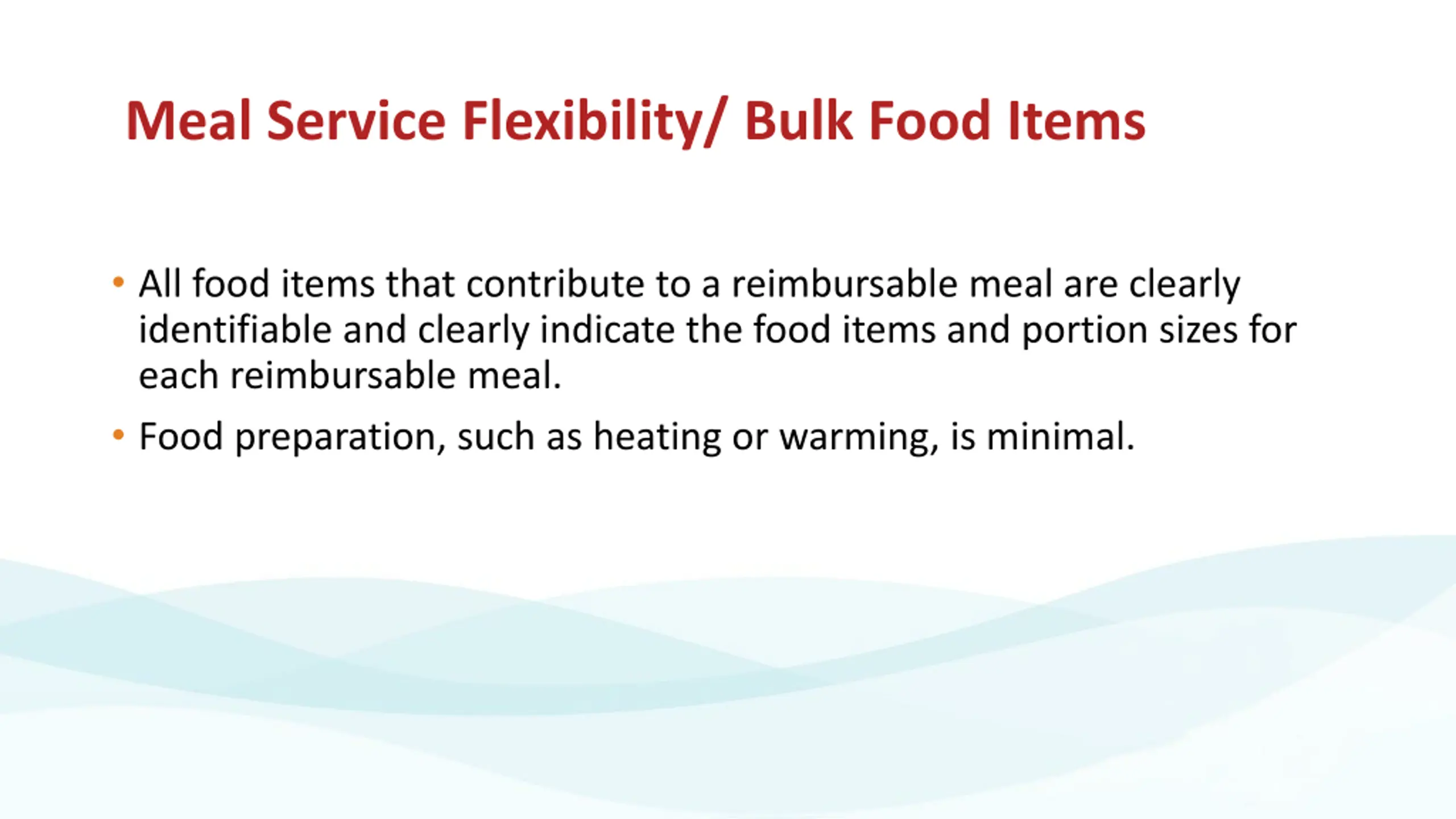 Meal Service Flexibility/ Bulk Food Items All food items that contribute to a reimbursable meal are clearly identifiable and clearly indicate the food items and portion sizes for each reimbursable meal. Food preparation, such as heating or warming, is minimal.