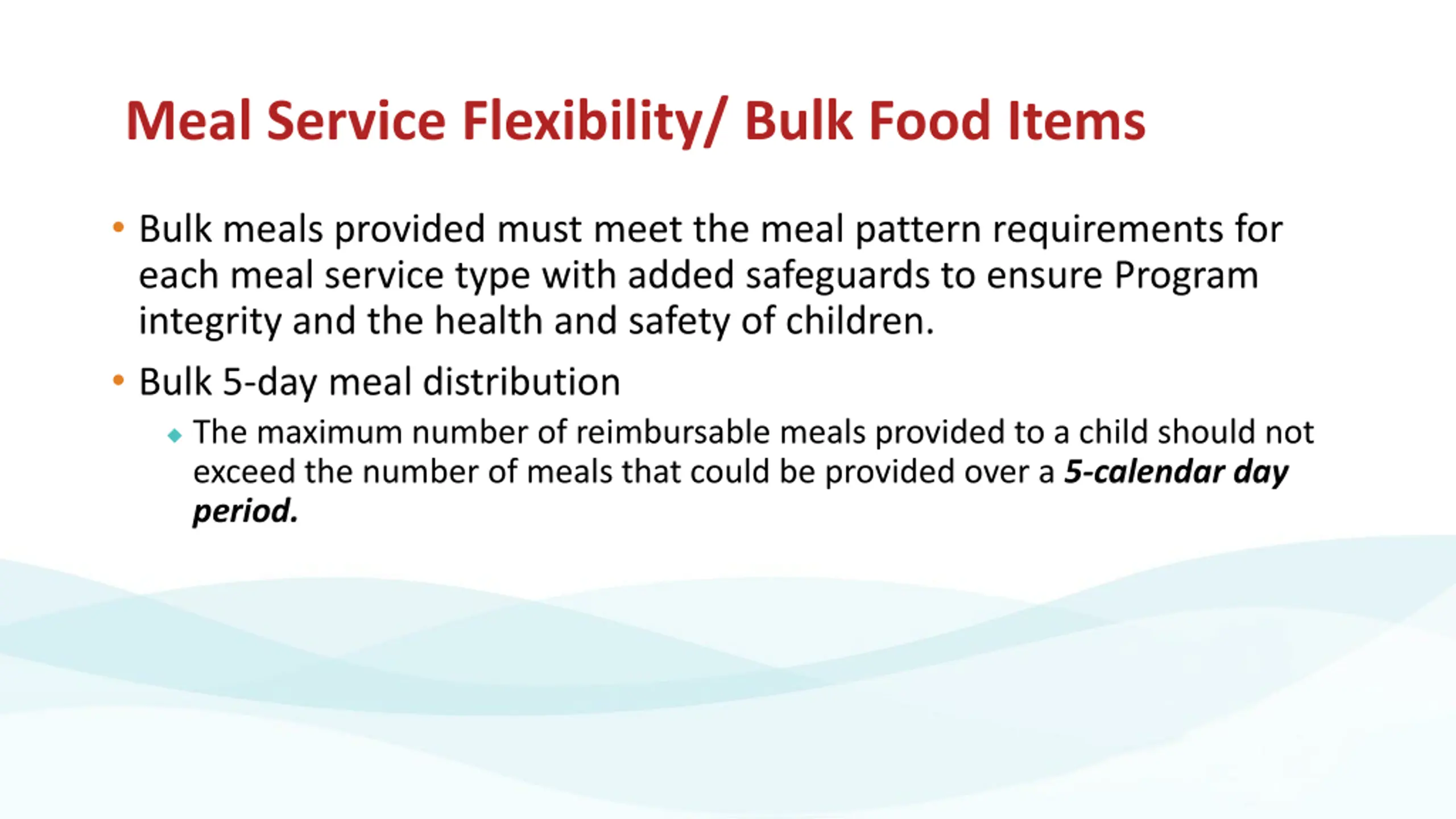 Meal Service Flexibility/ Bulk Food Items Bulk meals provided must meet the meal pattern requirements for each meal service type with added safeguards to ensure Program integrity and the health and safety of children. Bulk 5-day meal distribution The maximum number of reimbursable meals provided to a child should not exceed the number of meals that could be provided over a 5-calendar day period.