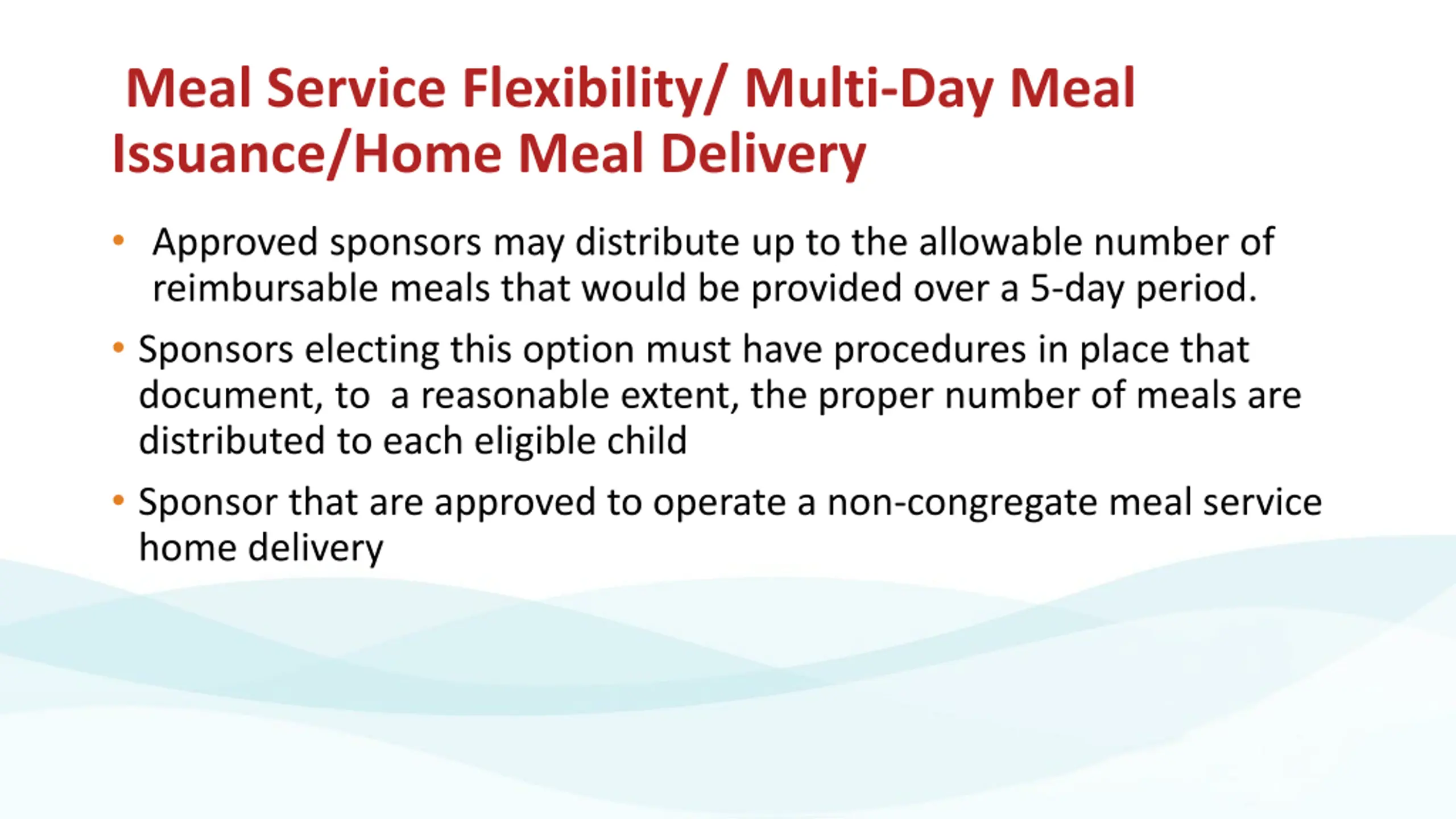 Meal Service Flexibility/ Multi-Day Meal Issuance/Home Meal Delivery Approved sponsors may distribute up to the allowable number of reimbursable meals that would be provided over a 5-day period. Sponsors electing this option must have procedures in place that document, to a reasonable extent, the proper number of meals are distributed to each eligible child Sponsor that are approved to operate a non-congregate meal service home delivery