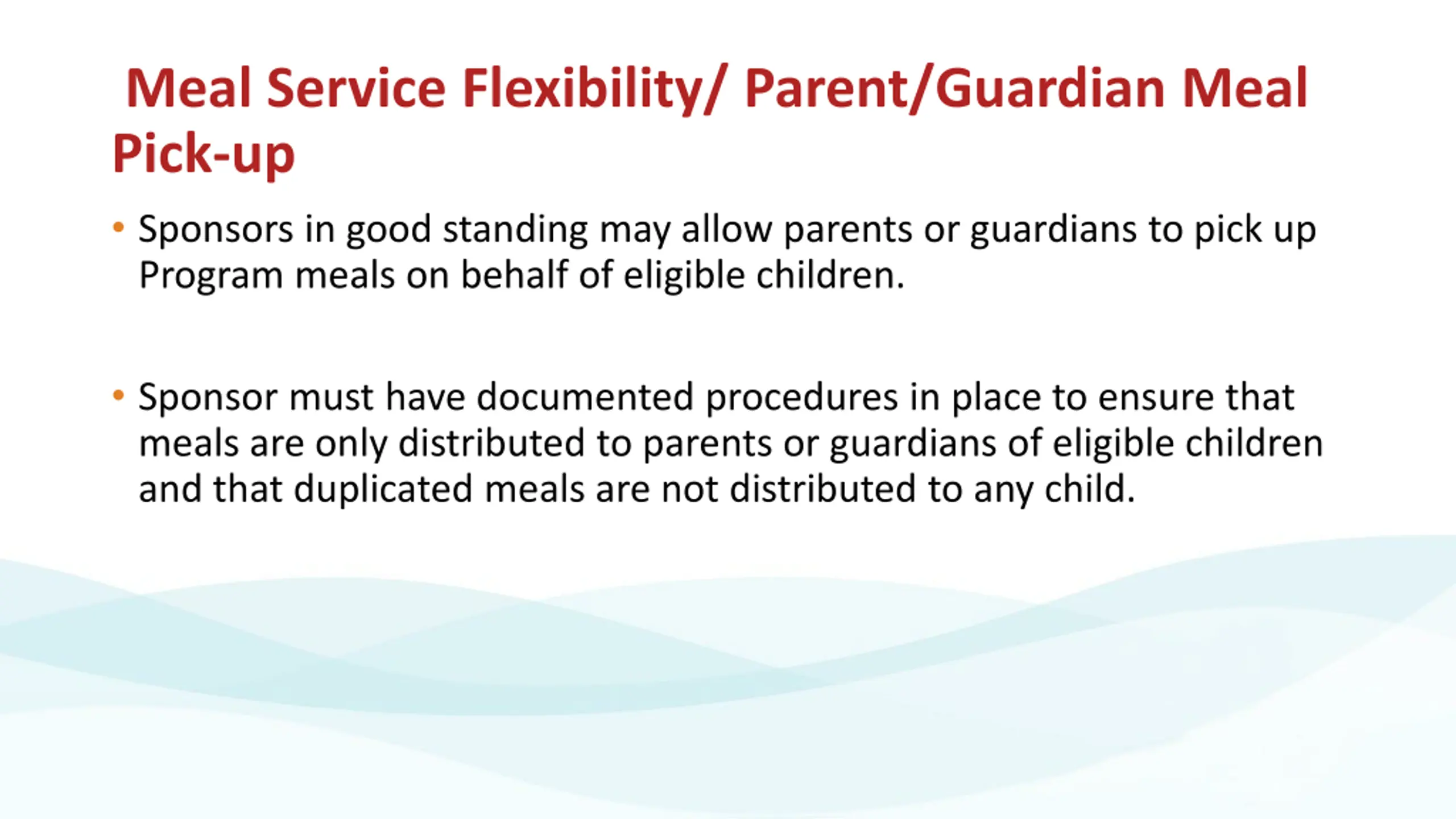 Meal Service Flexibility/ Parent/Guardian Meal Pick-up Sponsors in good standing may allow parents or guardians to pick up Program meals on behalf of eligible children. Sponsor must have documented procedures in place to ensure that meals are only distributed to parents or guardians of eligible children and that duplicated meals are not distributed to any child.