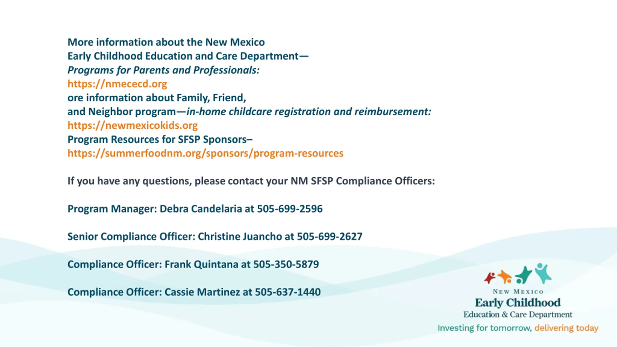 More information about the New Mexico Early Childhood Education and Care Department Programs for Parents and Professionals: https://nmececd.org ore information about Family, Friend, and Neighbor program in-home childcare registration and reimbursement: https://newmexicokids.org Program Resources for SFSP Sponsors https://summerfoodnm.org/sponsors/program-resources If you have any questions, please contact your NM SFSP Compliance Officers: Program Manager: Debra Candelaria at 505-699-2596 Senior Compliance Officer: Christine Juancho at 505-699-2627 Compliance Officer: Frank Quintana at 505-350-5879 Compliance Officer: Cassie Martinez at 505-637-1440