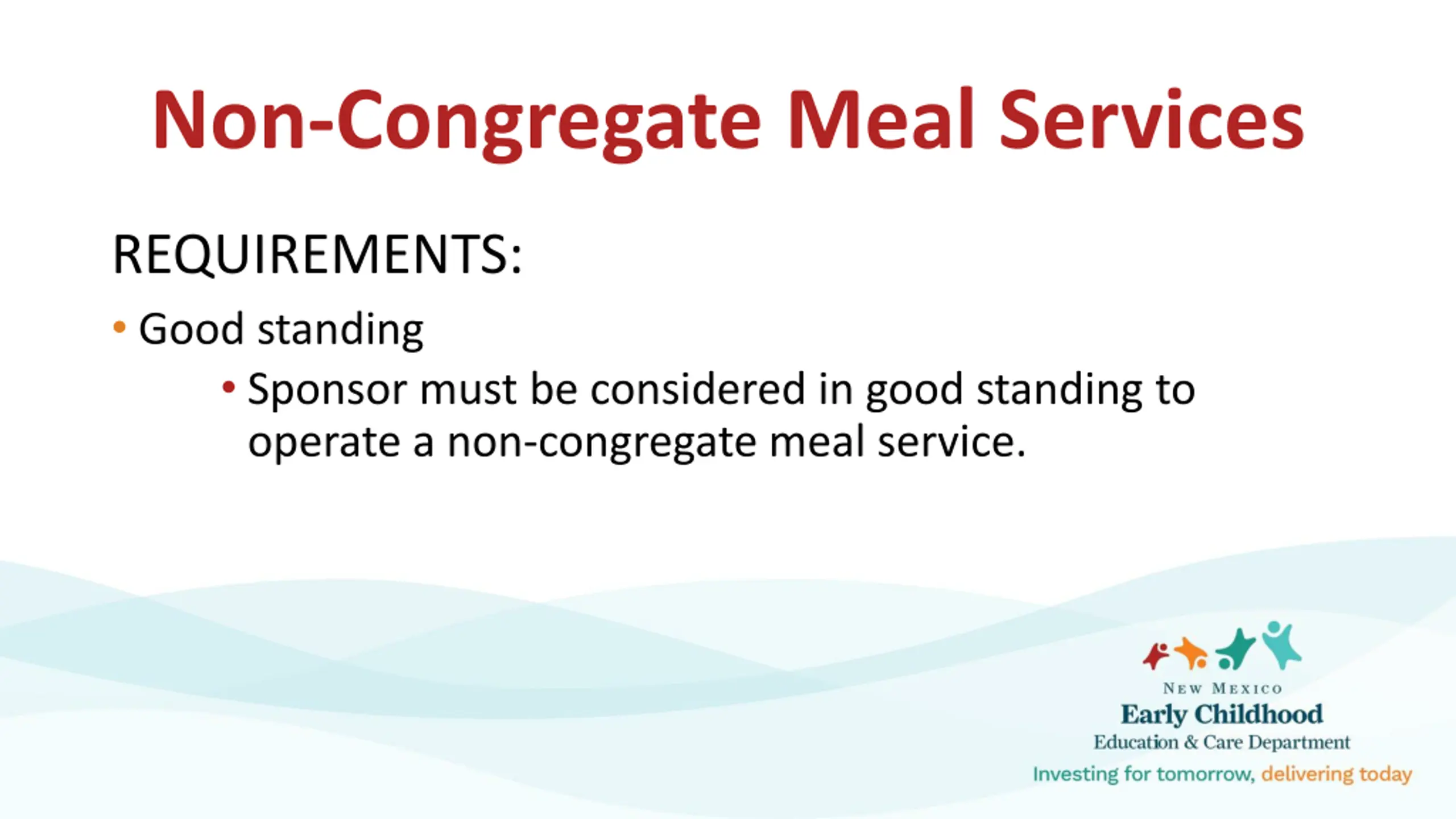 Non-Congregate Meal Services REQUIREMENTS: Good standing Sponsor must be considered in good standing to operate a non-congregate meal service.