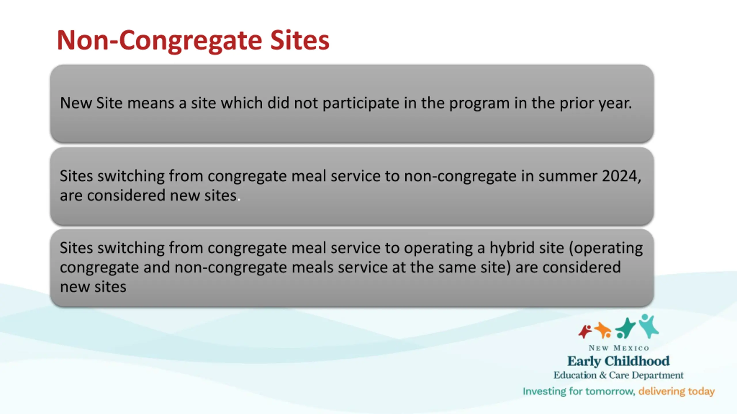 Non-Congregate Sites New Site means a site which did not participate in the program in the prior year. Sites switching from congregate meal service to non-congregate in summer 2024, are considered new sites. Sites switching from congregate meal service to operating a hybrid site (operating congregate and non-congregate meals service at the same site) are considered new sites