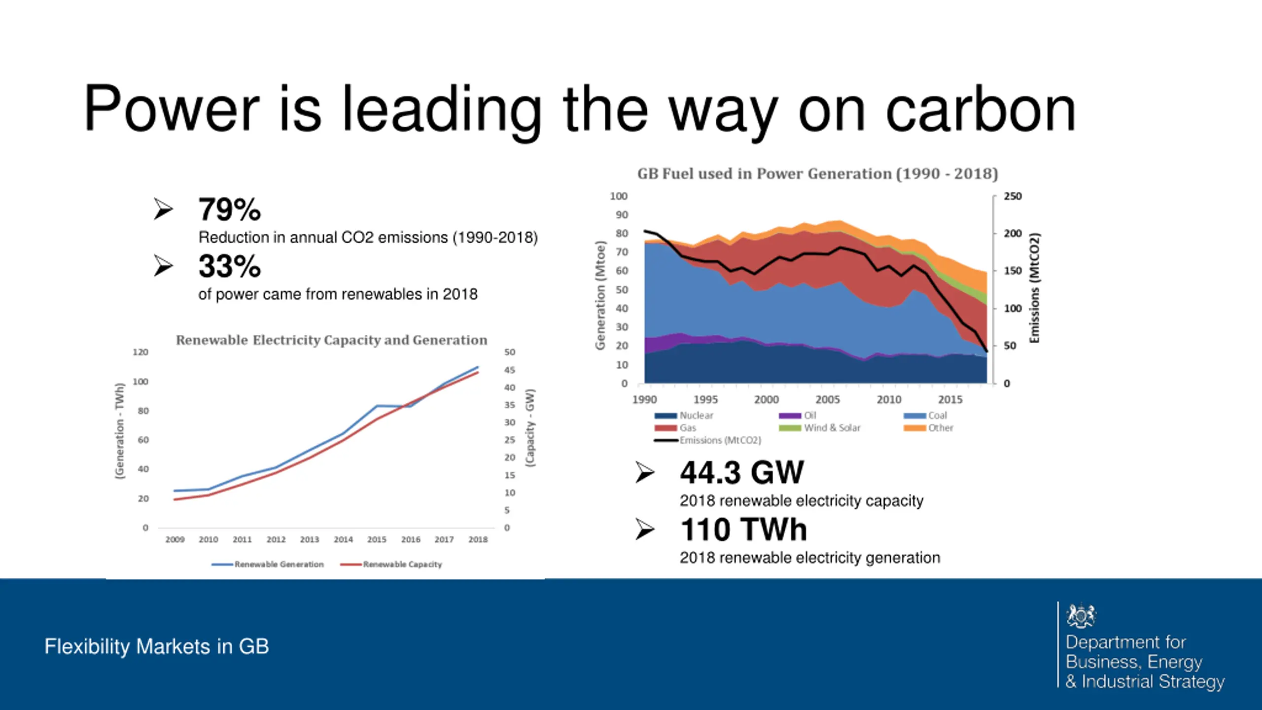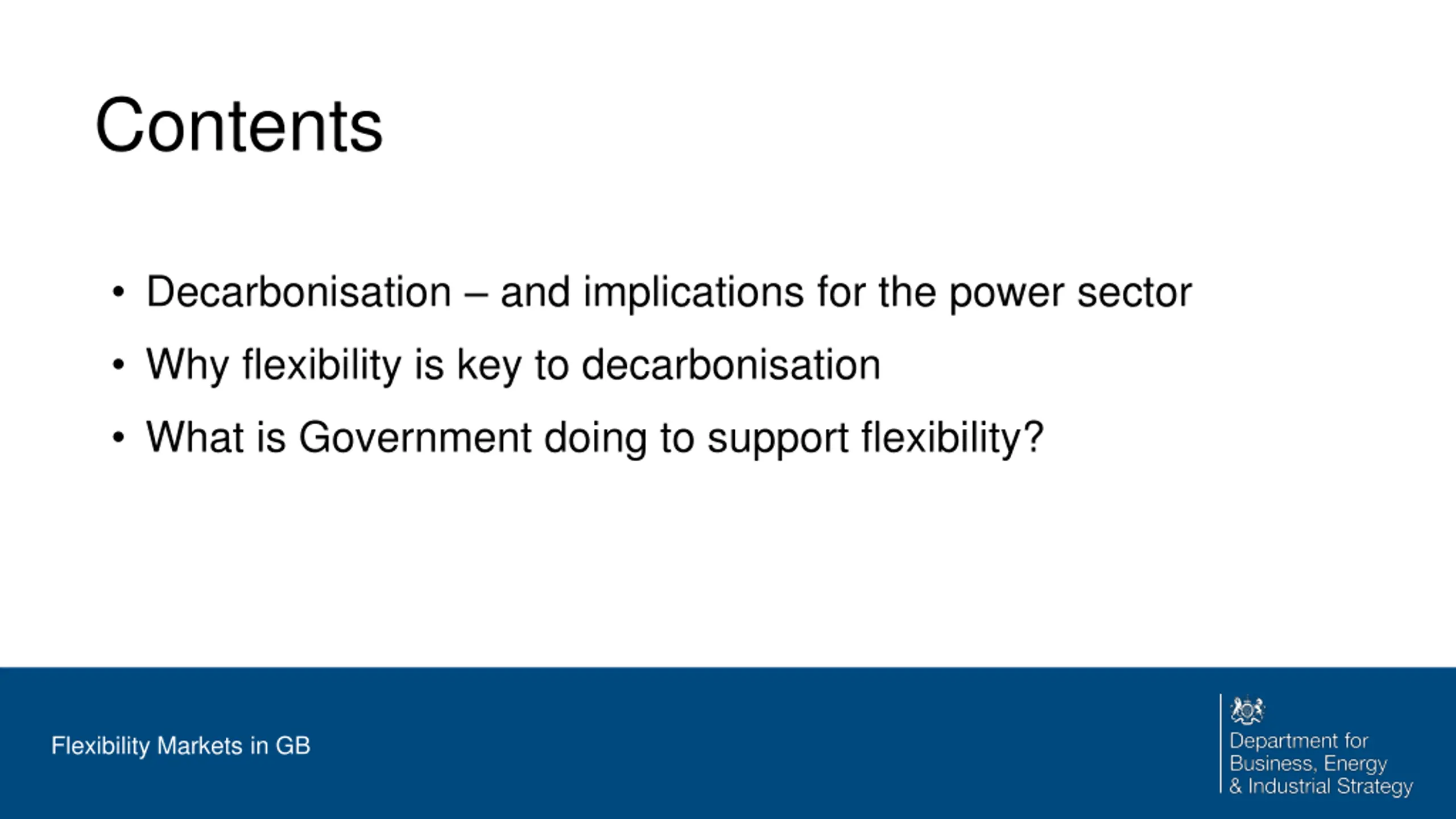 Contents Decarbonisation and implications for the power sector Why flexibility is key to decarbonisation What is Government doing to support flexibility? Flexibility Markets in GB