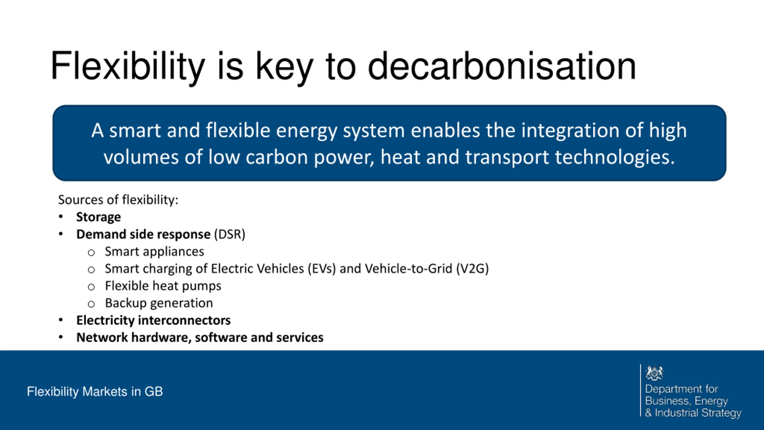 Flexibility is key to decarbonisation A smart and flexible energy system enables the integration of high volumes of low carbon power, heat and transport technologies. Sources of flexibility: Storage Demand side response (DSR) o Smart appliances o Smart charging of Electric Vehicles (EVs) and Vehicle-to-Grid (V2G) o Flexible heat pumps o Backup generation Electricity interconnectors Network hardware, software and services Flexibility Markets in GB